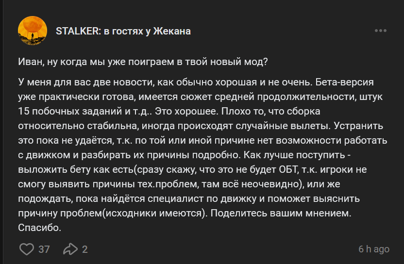 Анон, скажи, что тебя именно тянет к игре сталкер и к его миру? Что тебя так затянуло, что ты готов играть в это ещё и ещё, обсуждать итт эту игру? Поделись итт!