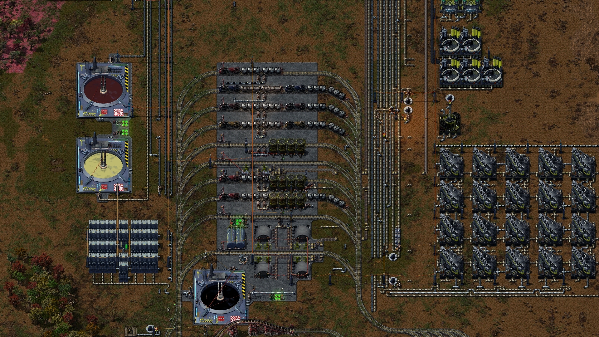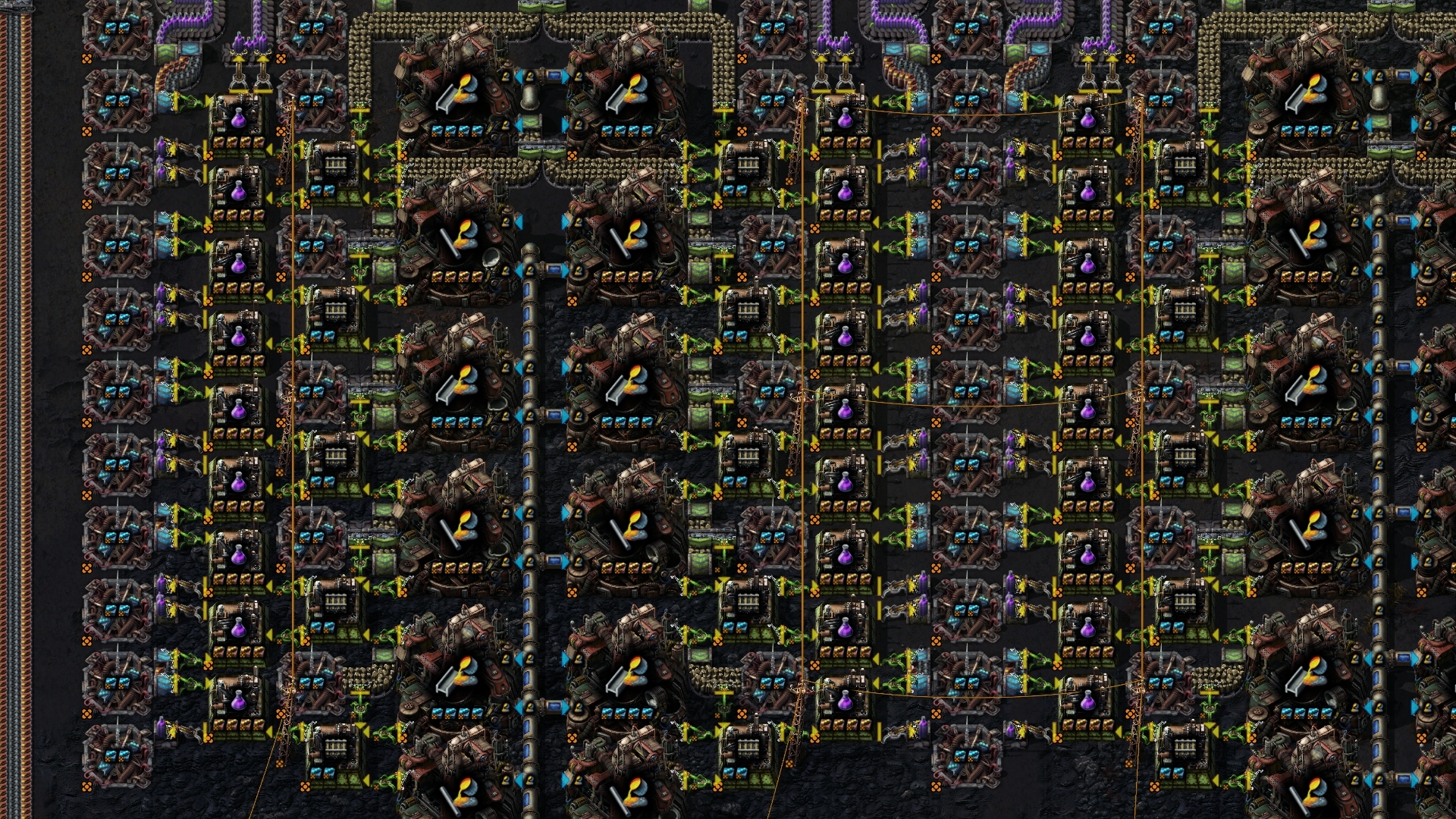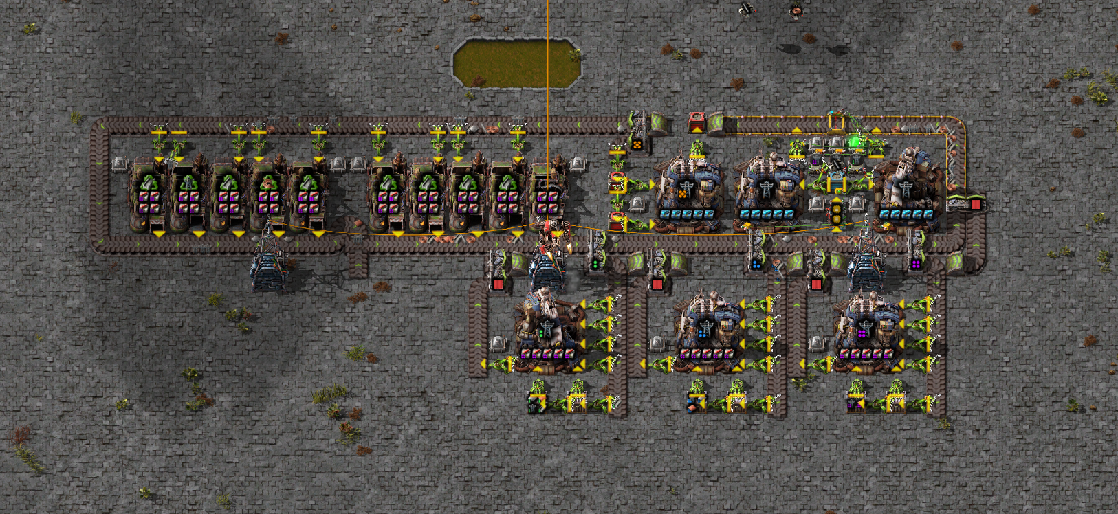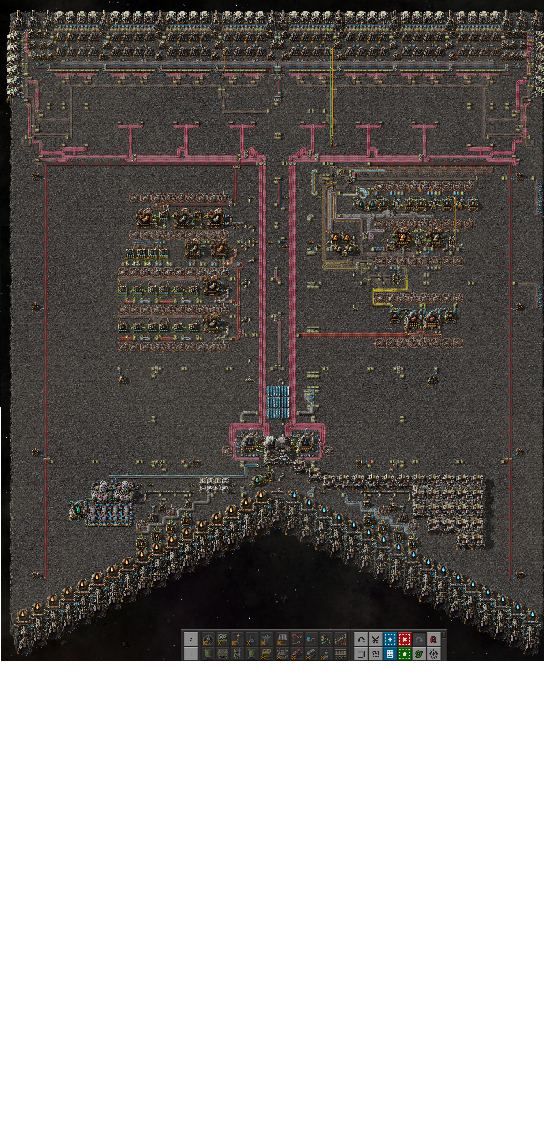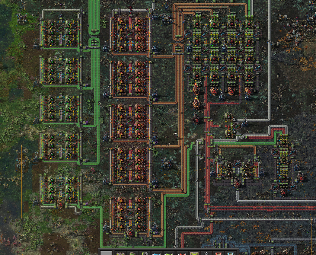 >>50286539 Это была попытка в централизованную переработку всех нефтегазопродуктов в пу. Идея была не то чтоб плохой и довольно элегантной (соединил всё в одну схему и знай настраивай приоритеты и правила), но в итоге упёрлась в совершенно безумный потенциальный размер инсталляции, вызывающий проблемы с масштиабированием и дикий траффик вокруг неё, так что в итоге пришлось это дело разнести по углам карты, к месторождениям. А хуёвину потихоньку демонтирую, хотя она мне пока ещё топливо делает. Потому что так красивее.