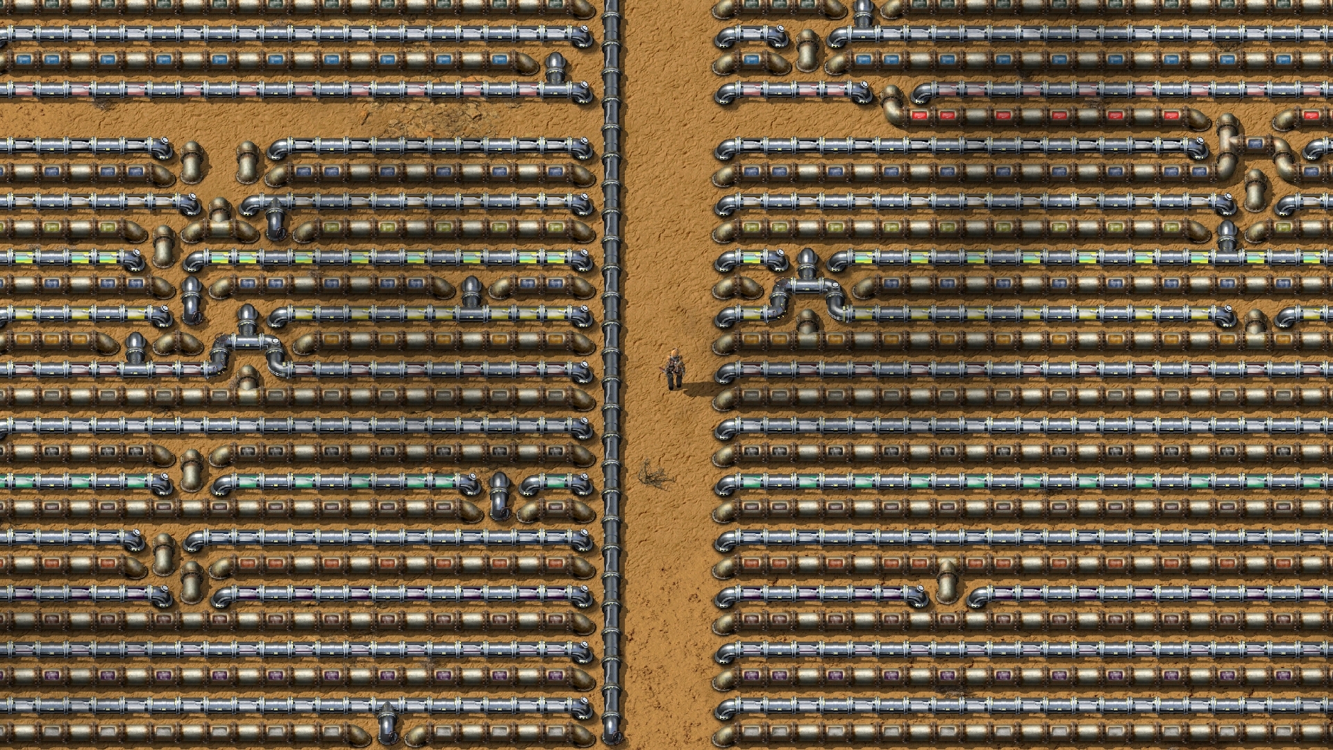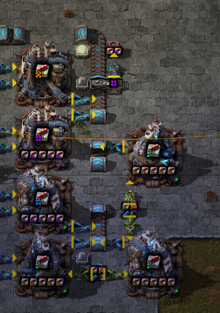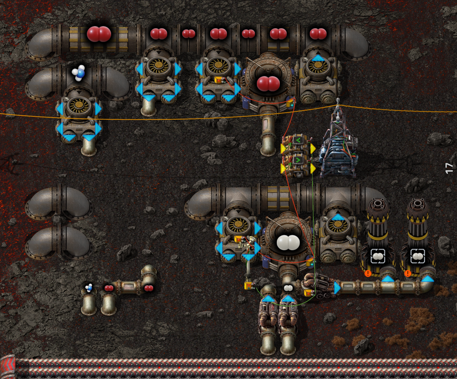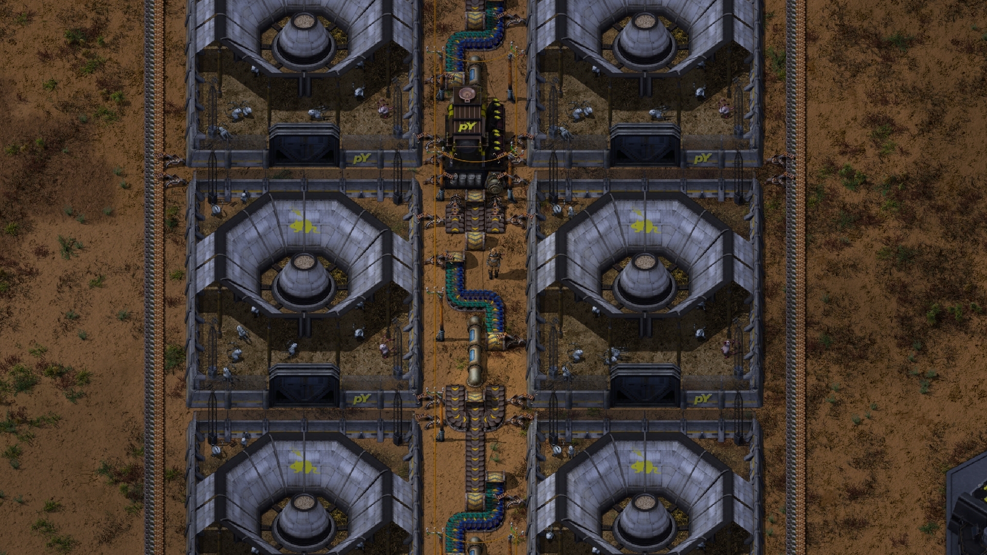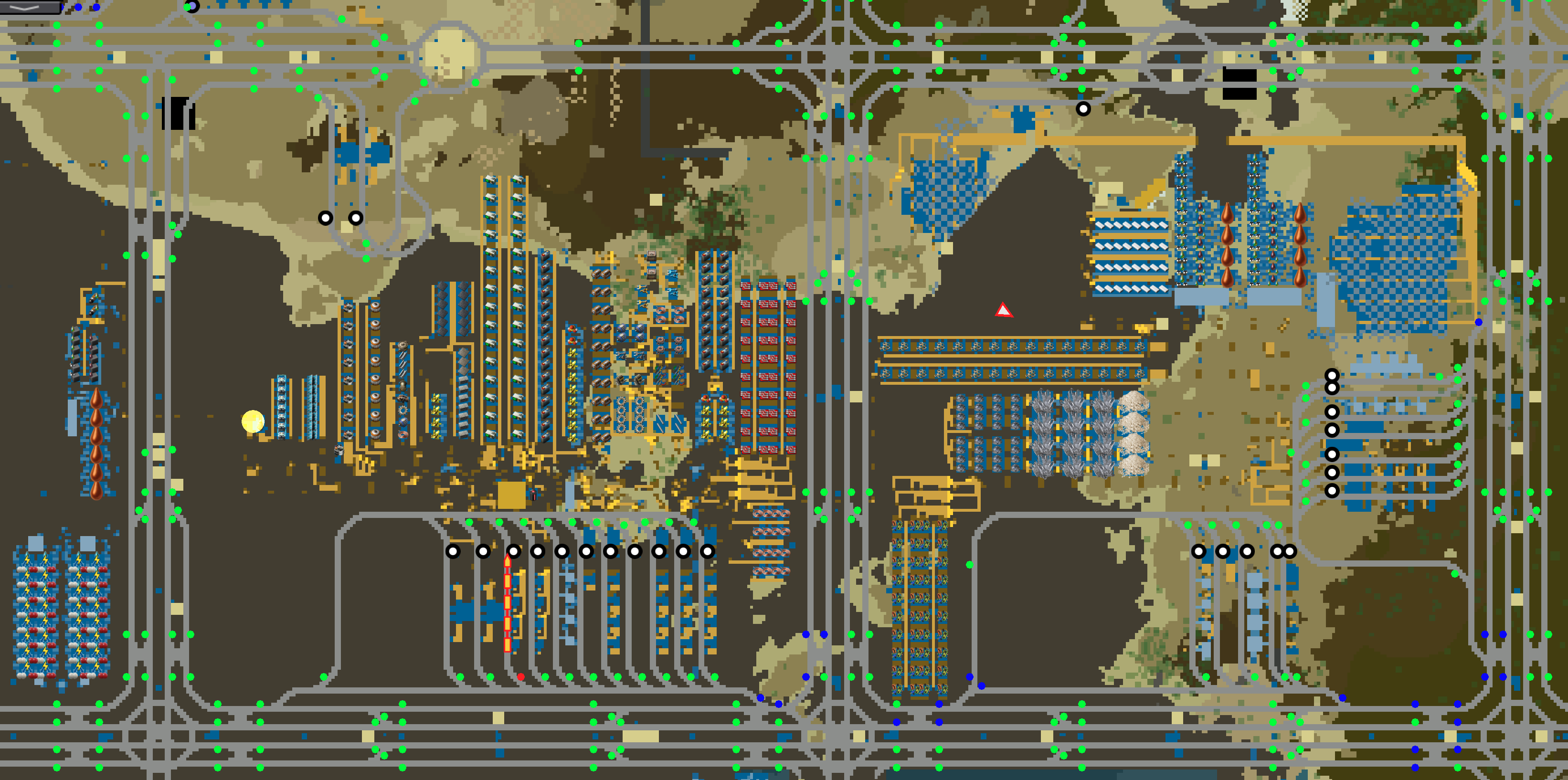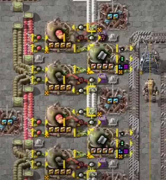 >>50286539 Это была попытка в централизованную переработку всех нефтегазопродуктов в пу. Идея была не то чтоб плохой и довольно элегантной (соединил всё в одну схему и знай настраивай приоритеты и правила), но в итоге упёрлась в совершенно безумный потенциальный размер инсталляции, вызывающий проблемы с масштиабированием и дикий траффик вокруг неё, так что в итоге пришлось это дело разнести по углам карты, к месторождениям. А хуёвину потихоньку демонтирую, хотя она мне пока ещё топливо делает. Потому что так красивее.