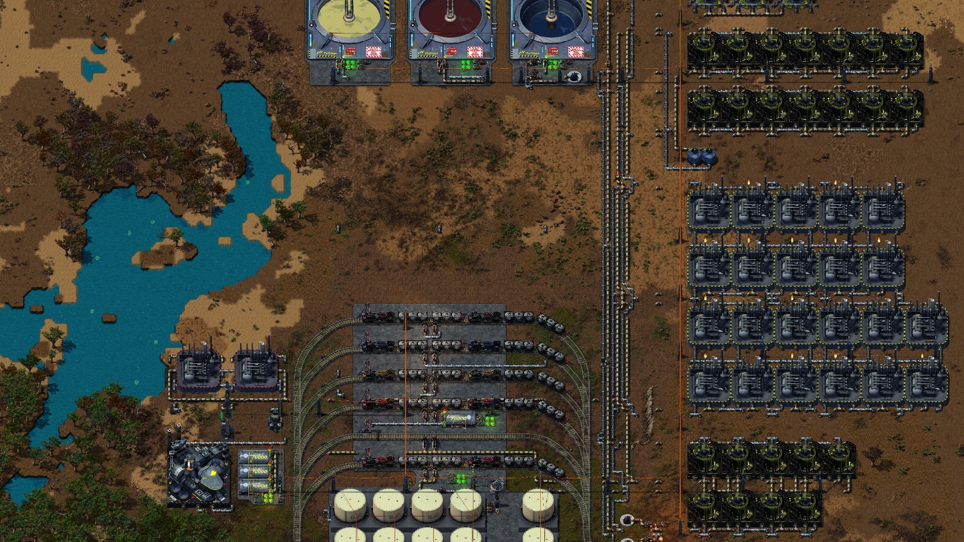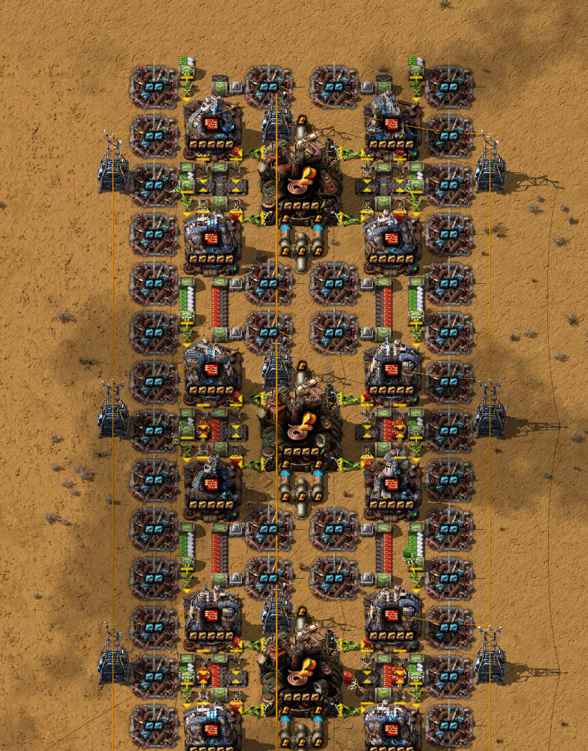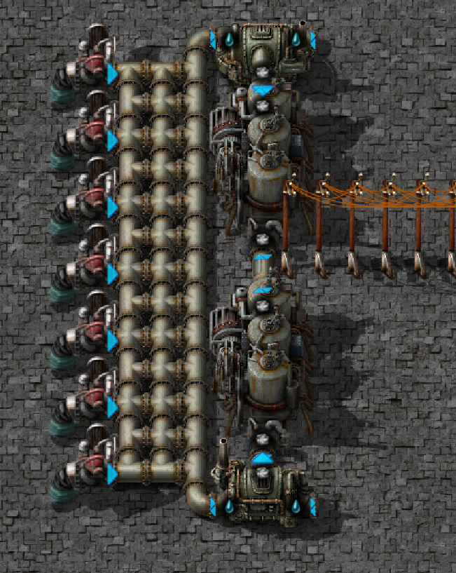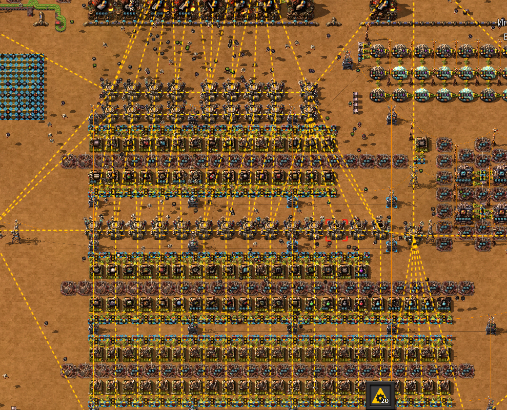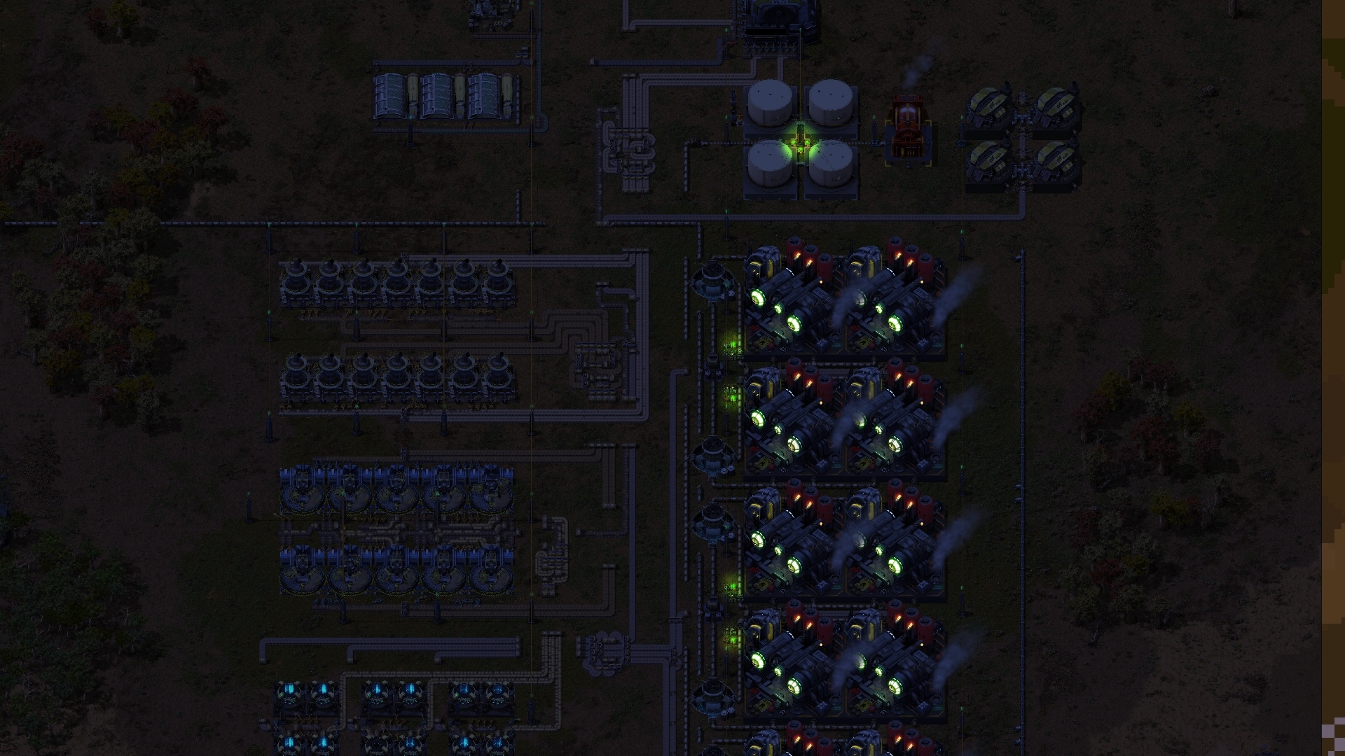 >>50286539 Это была попытка в централизованную переработку всех нефтегазопродуктов в пу. Идея была не то чтоб плохой и довольно элегантной (соединил всё в одну схему и знай настраивай приоритеты и правила), но в итоге упёрлась в совершенно безумный потенциальный размер инсталляции, вызывающий проблемы с масштиабированием и дикий траффик вокруг неё, так что в итоге пришлось это дело разнести по углам карты, к месторождениям. А хуёвину потихоньку демонтирую, хотя она мне пока ещё топливо делает. Потому что так красивее.