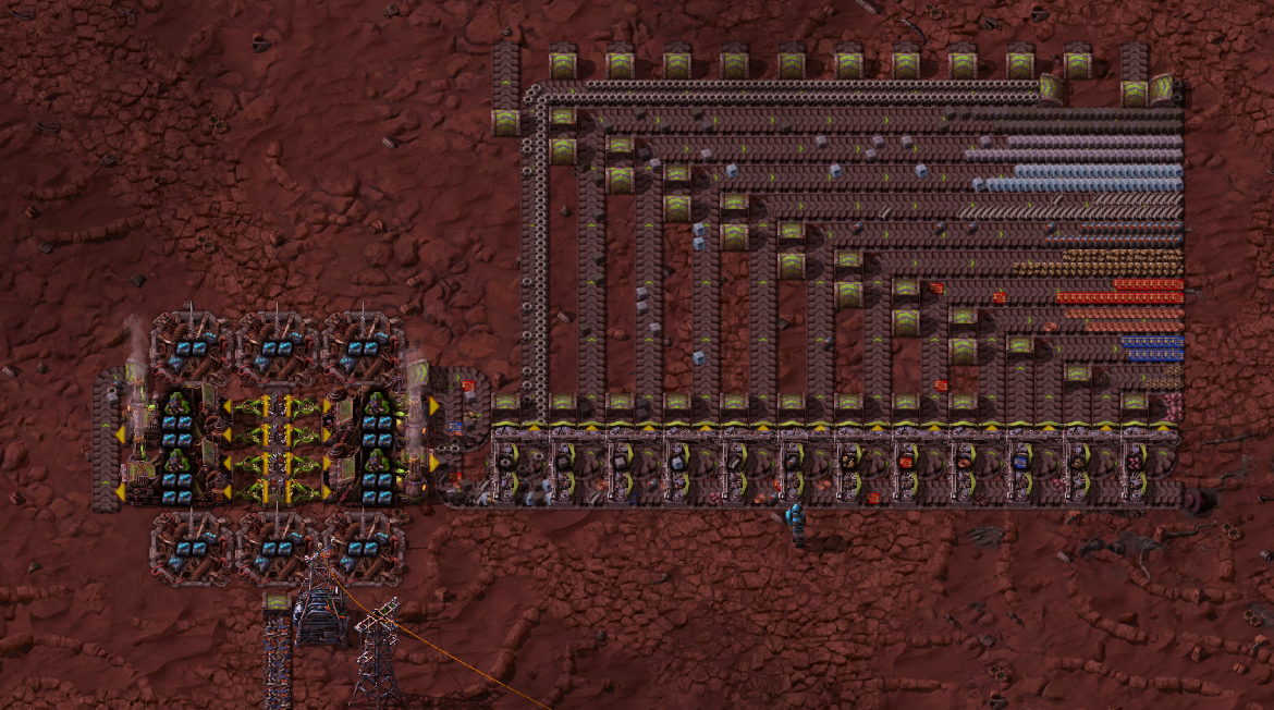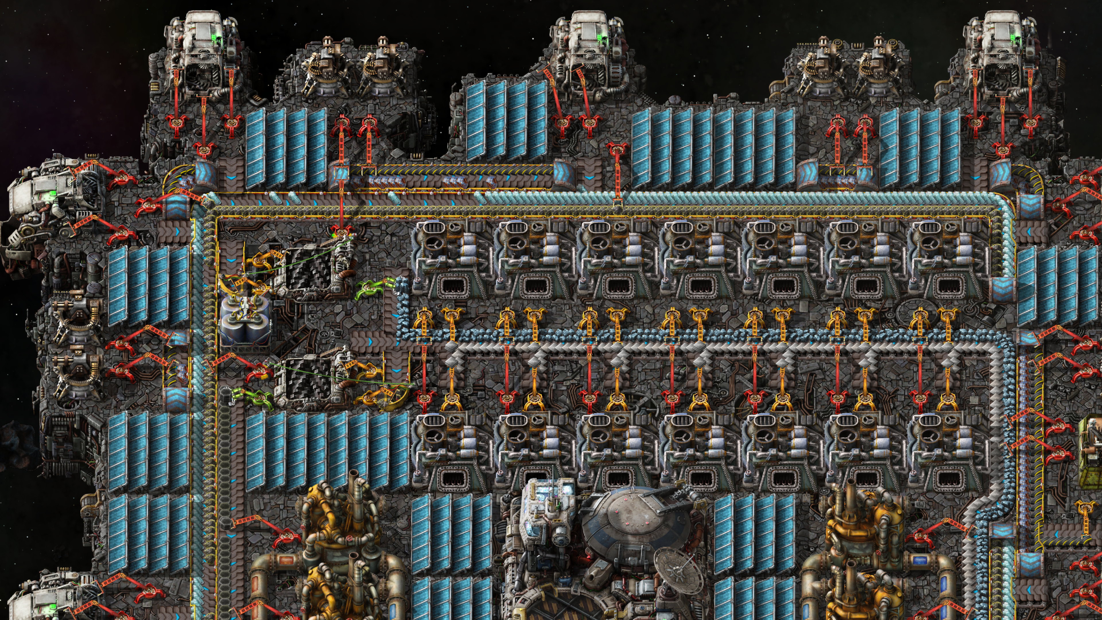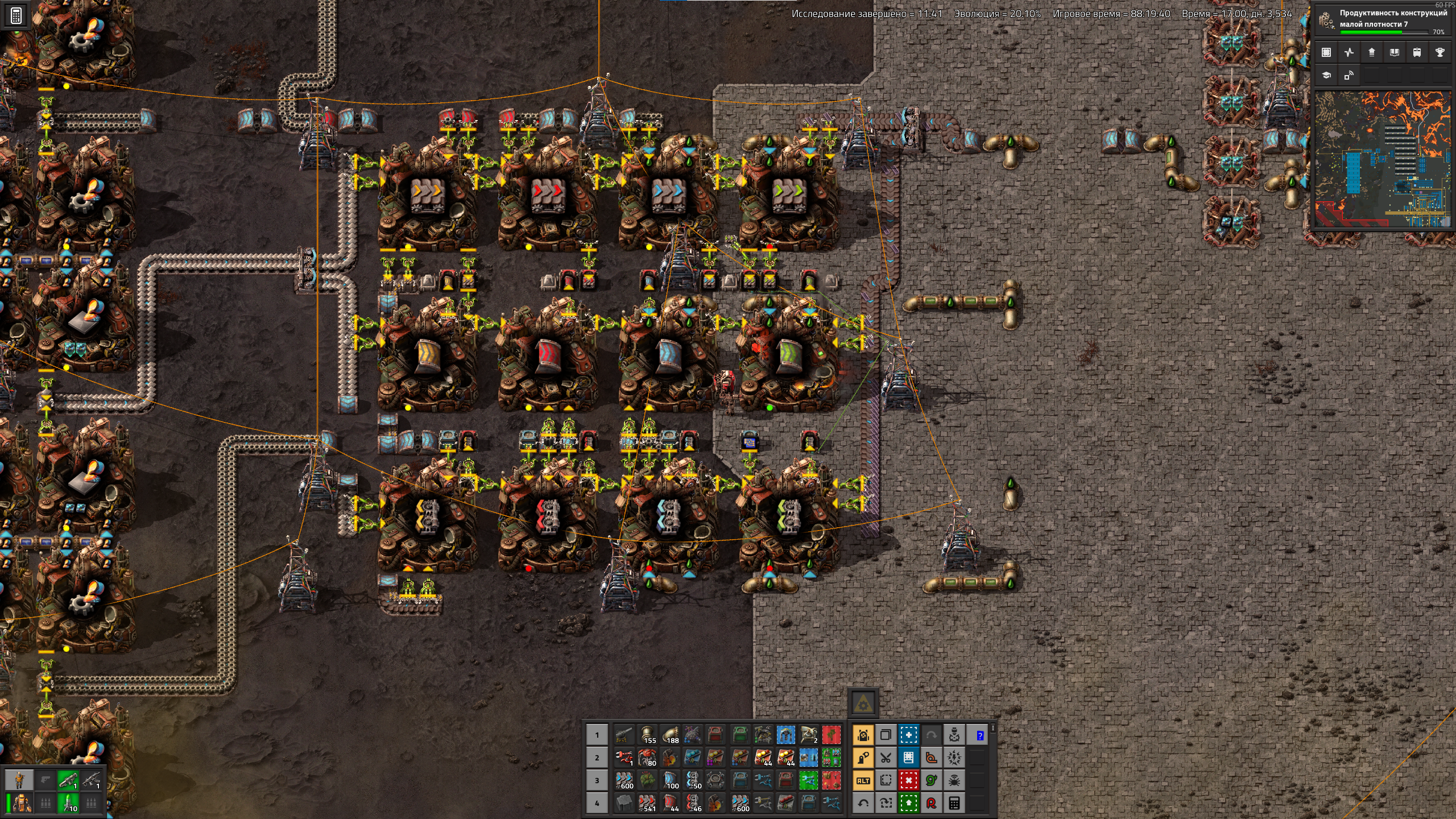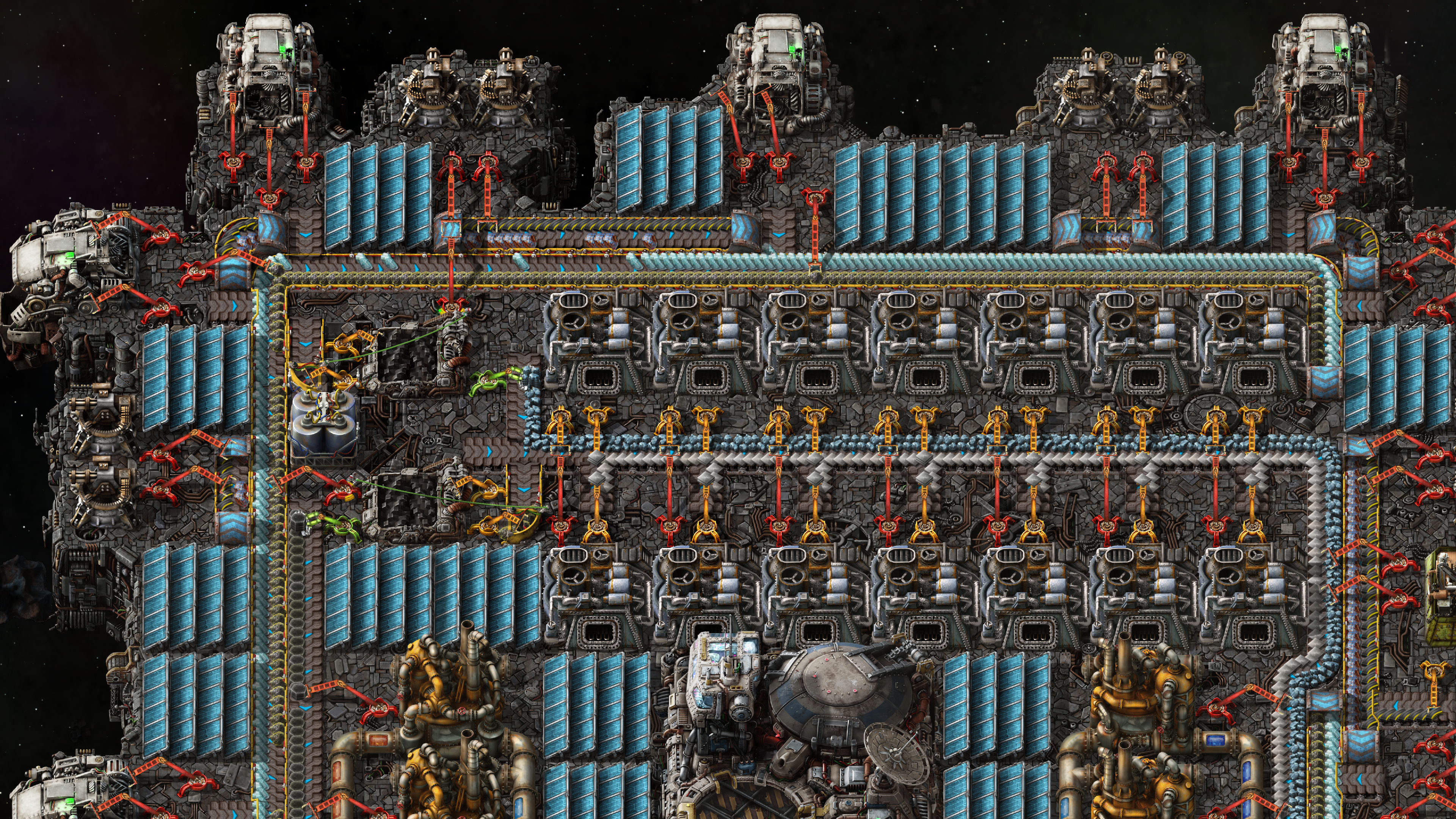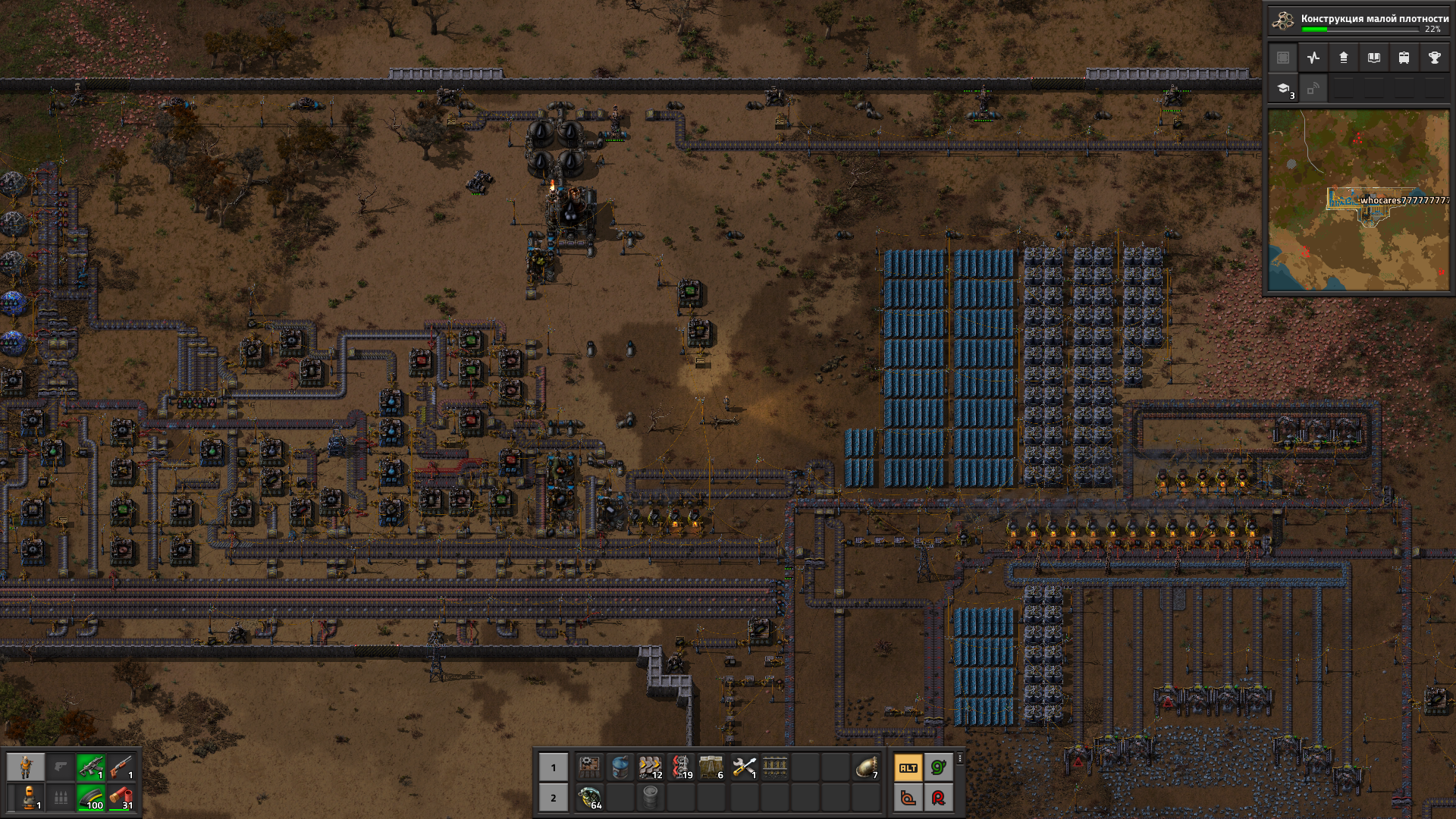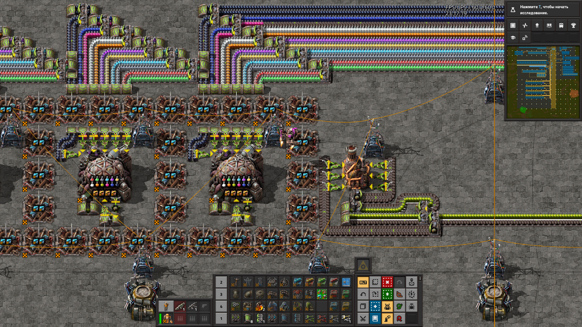 >>50276023 играю примерное по твоему принципу, (с учетом того что я ещё ничего не сжигаю, сливаю только грязный ил), база на синих+ банках работает, (поезда в основном пластины возят (скоро от этого откажусь, открыта плавка всех металлических деталей типо болтов, прутьев и тд из жидкого металла, буду трубами доставлять а возить поездами боракс и литейные подложки), дерево, мох куда нужно, некоторые растения, кокс банки на белтах, на дронах мини-молл работает, боеприпасы по периметру (арт.снаряды и патроны в турели), и редкие компоненты типо мк2 плат, всякие нейроматрицы и тд, т.е. те которые делаются в небольших количествах. База уже настолько плотная, что думаю надо сделать сбоку от неё жидкостную шину (как раз сейчас пластины не нужны будут во все места, мелочевка вся будет делаться из жижи). Но с жуками тяжеловато воюется (танк + дроны vs 70 эволюции)