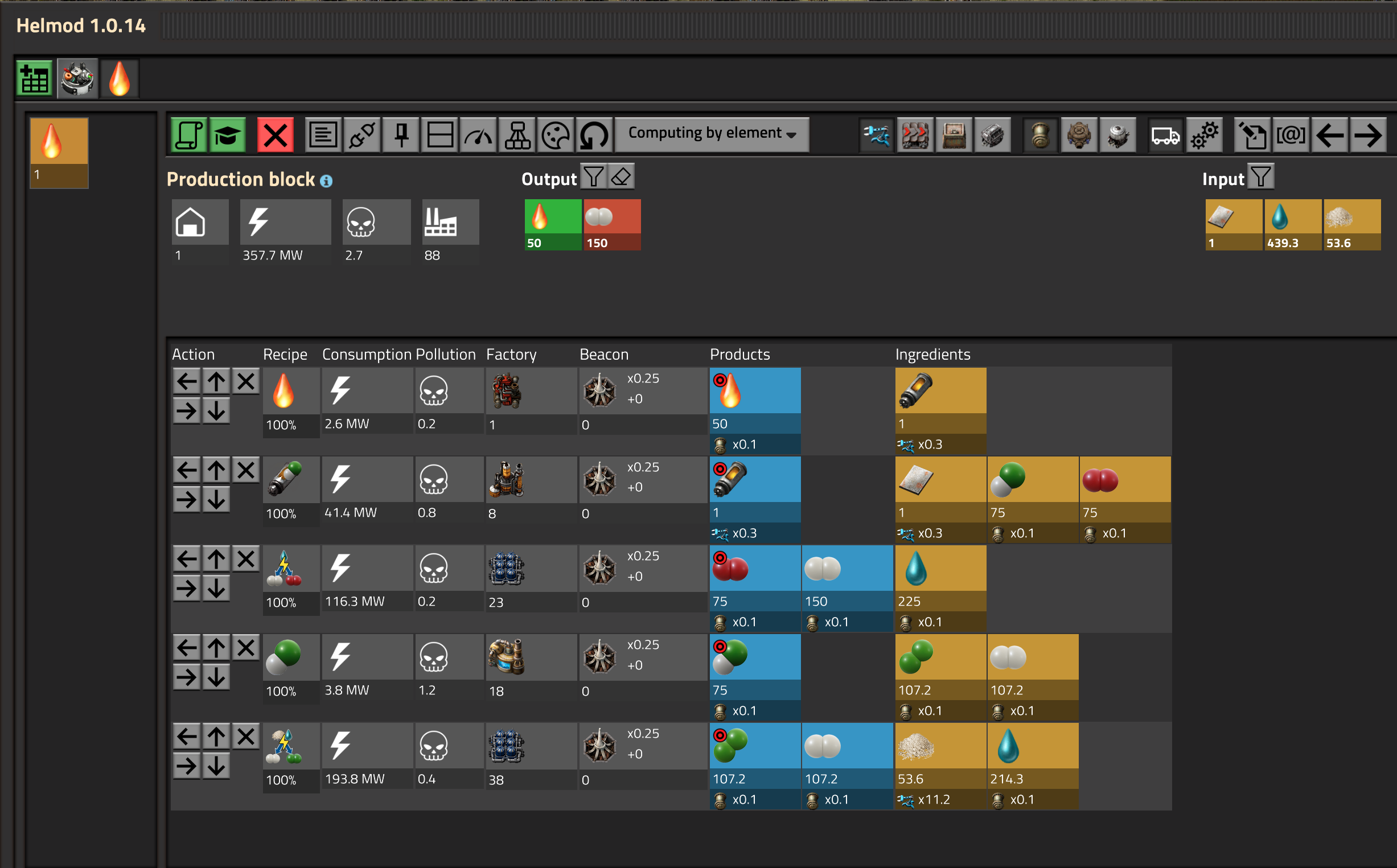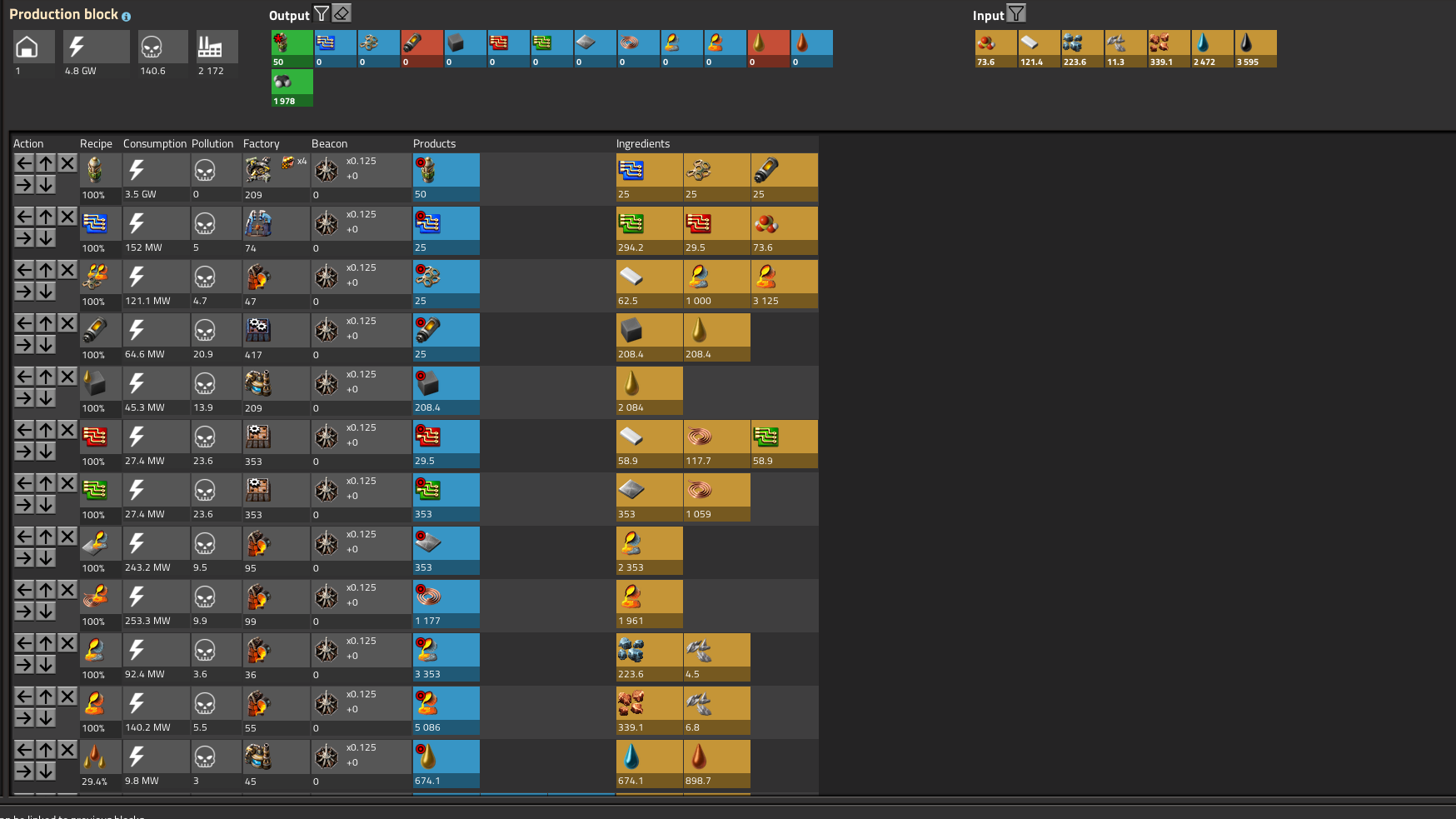 >>50074733 У меня маленькая фулгора, я вот сейчас как раз думаю, делать большие базы, или я уже наигрался. Гольмий вот, линии скрапа считать немного неудобно, т.к. у меня там в паре мест нечитаемый пиздец нахуеверчен, но можно вот так продакшен и консампшен посчитать, а дальше сам дели на линии, такие дела.