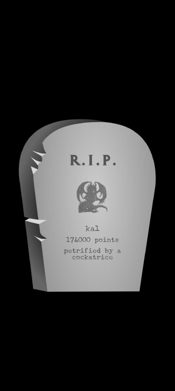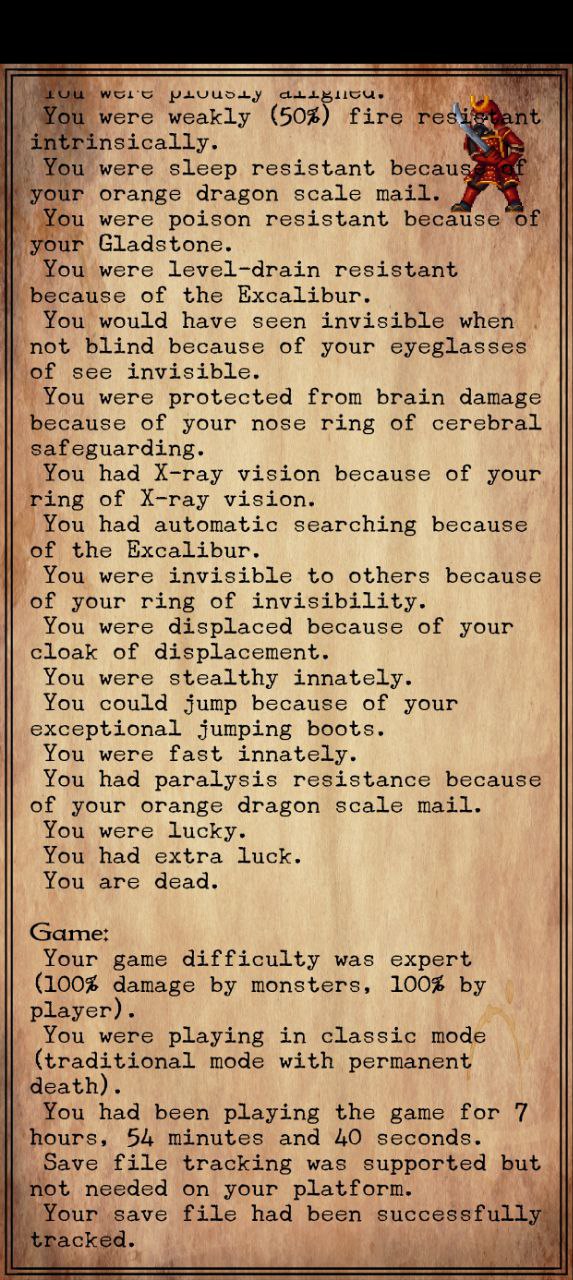 >>50093611 Бля, а так ахуенно все начиналось... Нашел кольцо на +25%хп и пояс на +50%хп и кольцо с резистом к яду. Спустился в гномьи шахты, там тоже все относительно неплохо шло. Облом разве что с тем, что тачстоун не выпал и была куча неопознанных гемов. Зато жратвы было много, всяких грибов и зелий налутал, но неопознанное все( А из-за гемов денег мало и в городе ничего особо не купил. Дошел до последнего уровня шахт и на обратном пути на меня напал допльгангер и я сдуру решил его туп сожрать и превратился в нагу хачлинга. Пока шел в этой форме на меня напала мумия и заразила( Пидарастических бог отказался мне помогать и лечилок никаких не было, так и сдох от гангрены( Обидно. Больше не буду жрать что попало.