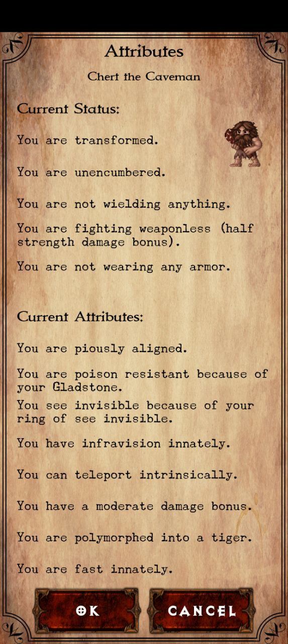 Что за нах? Душусь в этом забеге пиздец просто. Лишний раз стараюсь неопознанное не одевать, бегал оружку\броню прокачивал на первые уровни + заправлял фонарь, вроде как довольно неплохо одет, но с какого-то лвла меня начинает рандомно телепортировать... я весь инвентарь обшарил - ничего. Потом иду и хуякс - меня в тигра превращает с нихуя. Ну ладно, может на ловушку встал или какой-то хуй из палочки полиморфа выстрелил издалека. А у тигра хп мало, я чуть от гаргульи не откис, съебал от нее на свитке телепорта, отхилился, потом подчистил уровень. Иду дальше - опять меня продамажили, я убежал и решил отдохнуть и тут на меня веревольф нападает, с тигром нахуй! И дают мне нехилой такой пизды. Я на последних хп молюсь - меня обратно в человека превращает и отхиливает. Хватаю дубину, одеваю броню, даю им пизды и меня снова в волка превращает! Я опять молюсь, меня снова в человека, я их добиваю, лутаюсь, использую единственный свиток идентификации на кольцо и оно, внезапно, оказывается Protection from Shape! Ну, по-идее, от этих внезапных полиморфов я спасен, но вот телепортация никуда не пропала. Я вижу, что в стате что-то типа природного телепорта, но что это за хуйня? Это что? Прокачиваешься и начинаешь просто рандомно телепортироваться? В чем сакральный прекол?