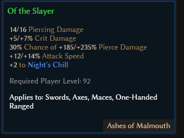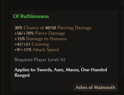 >>50438996 Не туда смотришь, эндгеймовые пирсовики-блейдмастера все поголовно собираются с tyran's префиксом, потому что он снижает входящий дамаг от мобов и боссов и позволяет лучше выживать. А суффиксом вместо spines берешь вот это, тонна дамага, каннинга, урон по людям и атак спид ещё на случай, если он до капа не добит.