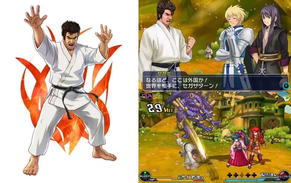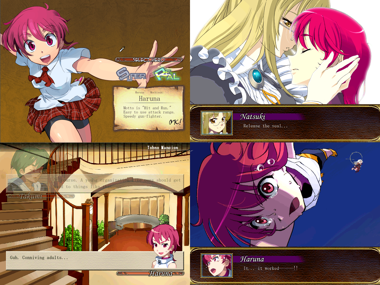 Как и в OG, на выбор предлагается два протагониста: с одной стороны- уверенный в себе бедный студент, любитель милф и "меч, разрубающий зло богов" (прямая отсылка к Зенгару Зонволту в игре, ага) Такуми Атсута; а с другой- наивная тп-школьница и лесбуха с запечатанной силой предвидения будущего Харуна Мочизуки. Я не мелкобуква, поэтому проходил за первого, разумеется. К слову, отсылки к роботам в игре повсюду: в роли врагов попадаются всякие геттеры, парная атака горничных V-slasher- это реверанс в сторону Комбаттлера и Вольтес, а Широ с Сакурой в свой парной атаке косплеят Домона и Рейн.
