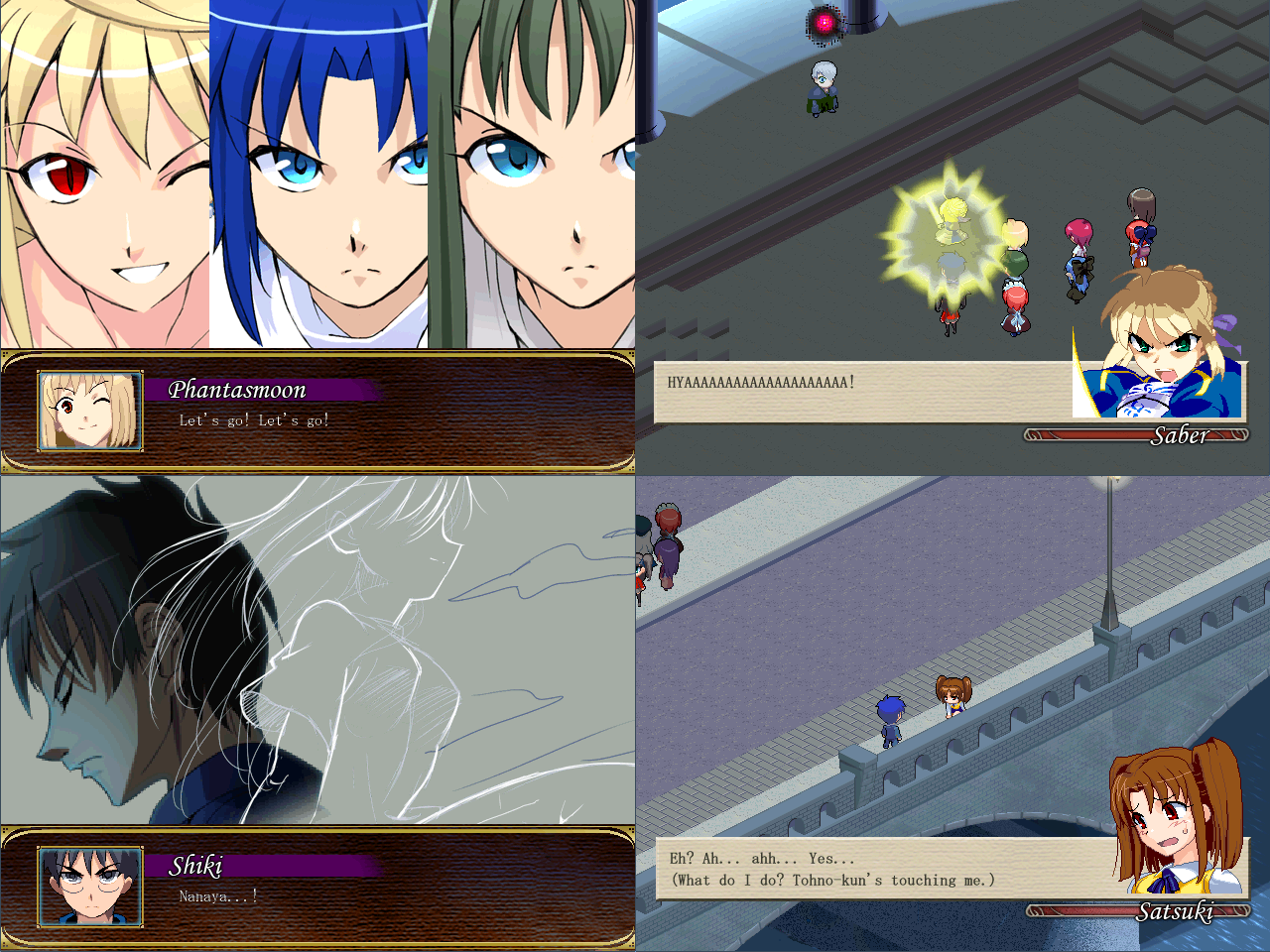 Сюжет ценности практически не имеет, как по мне. События происходят уже после событий Tsukihime, Fate (мерзкой Heaven Feel) и Melty Blood. Злодеи пытаются провести ритуал подавления душ, чтобы ценой кучи жертв запечатать... дьявола... для чего развязывают очередную войну за Грааль в городе Мисаки, где мастерами выступают всякие внезапно ожившие вампиры. Оригинальные персонажи работают на стороннюю организацию йокаев под названием Shin'i (подозрительно напоминает Шинру из "Нямко против Крэпкома"), которая следит за балансом и расследует всякие отклонения.