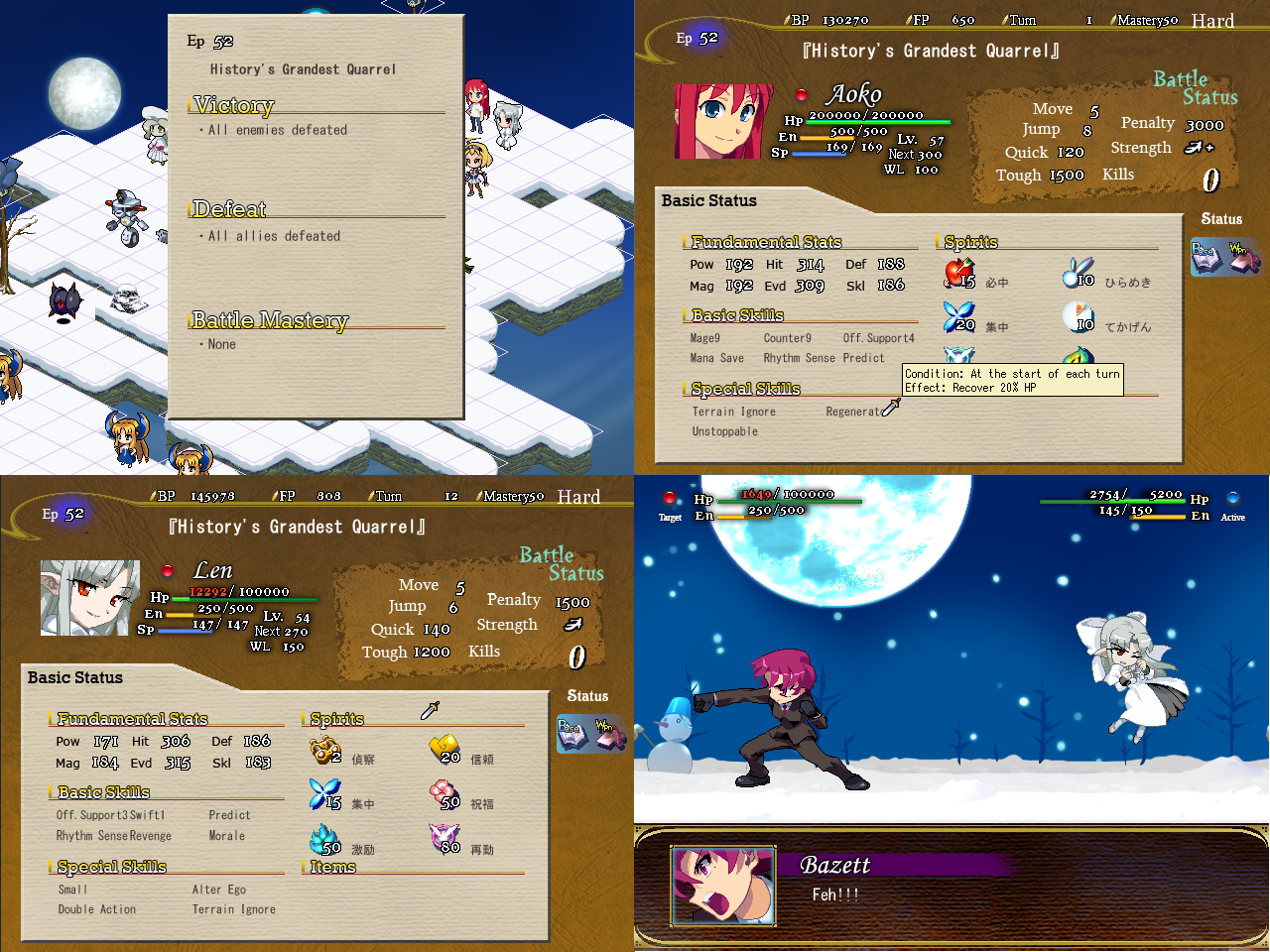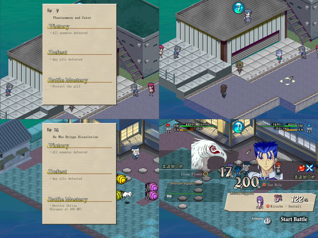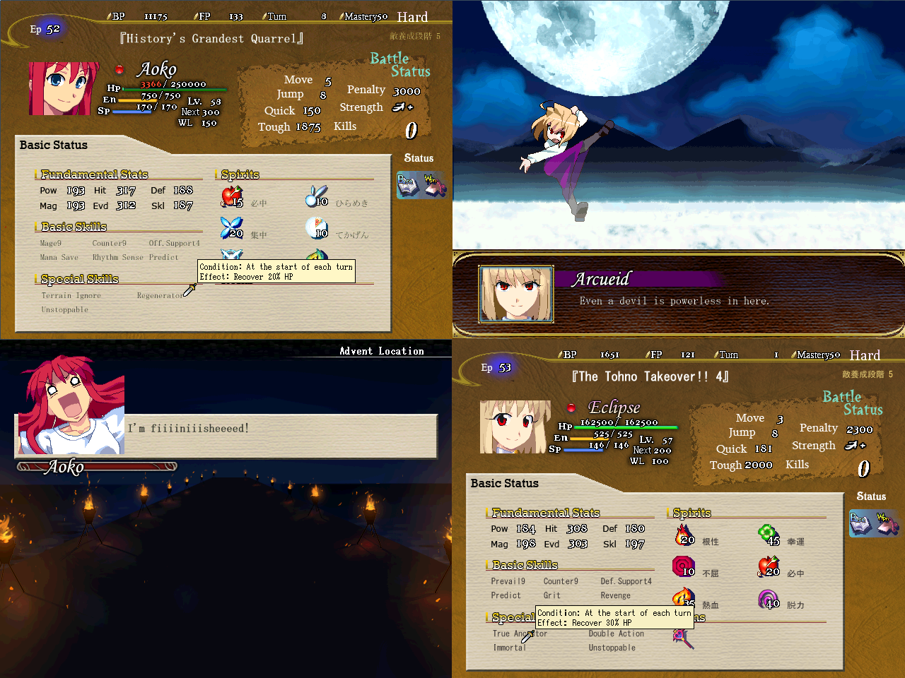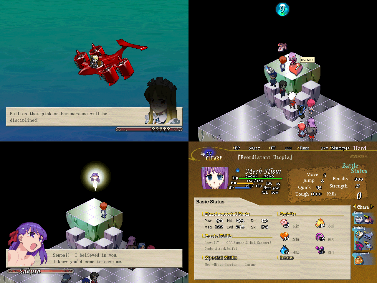 Но есть неприятные баги. Первый вообще не критичный- саппорт-атака в игре в принципе работает криво: считается, что юнит, совершающий саппорт атаку, бьет не со своей клетки, а с клетки юнита, проводящего основную атаку. Второй ОЧЕНЬ КРИТИЧНЫЙ- после победы в финальном 51 эпизоде игра просто закрывается, причем и на семерке, где я ее проходил первые два раза, и на десятке. Никакие совместимости не помогают, сам я этот момент всегда проскакиваю на старом компе с ХР (возможно, сработает и на виртуальной машине с ХР)- только надо учесть, что для нормального шрифта игре нужна поддержка японского языка в системе, которого в ХР по умолчанию нет, если его при установке не добавить. Третий обходится геймплейным абъюзом: в финальном бонусном 53 эпизоде Сэйбер Лили хреначит площадной атакой, и если в радиусе ее действия никого не окажется, она ее запустит в молоко, а игра вылетит с ошибкой. Очевидно, надо просто держать под ней персонажа с высоким уворотом и сохранять перед концом хода, чтобы загрузить, если он вдруг огребет. Но я в этот раз убил ее еще до того, как она стала по площади бить.