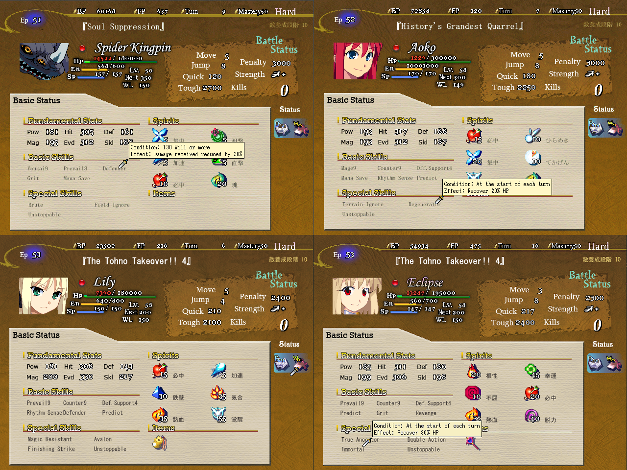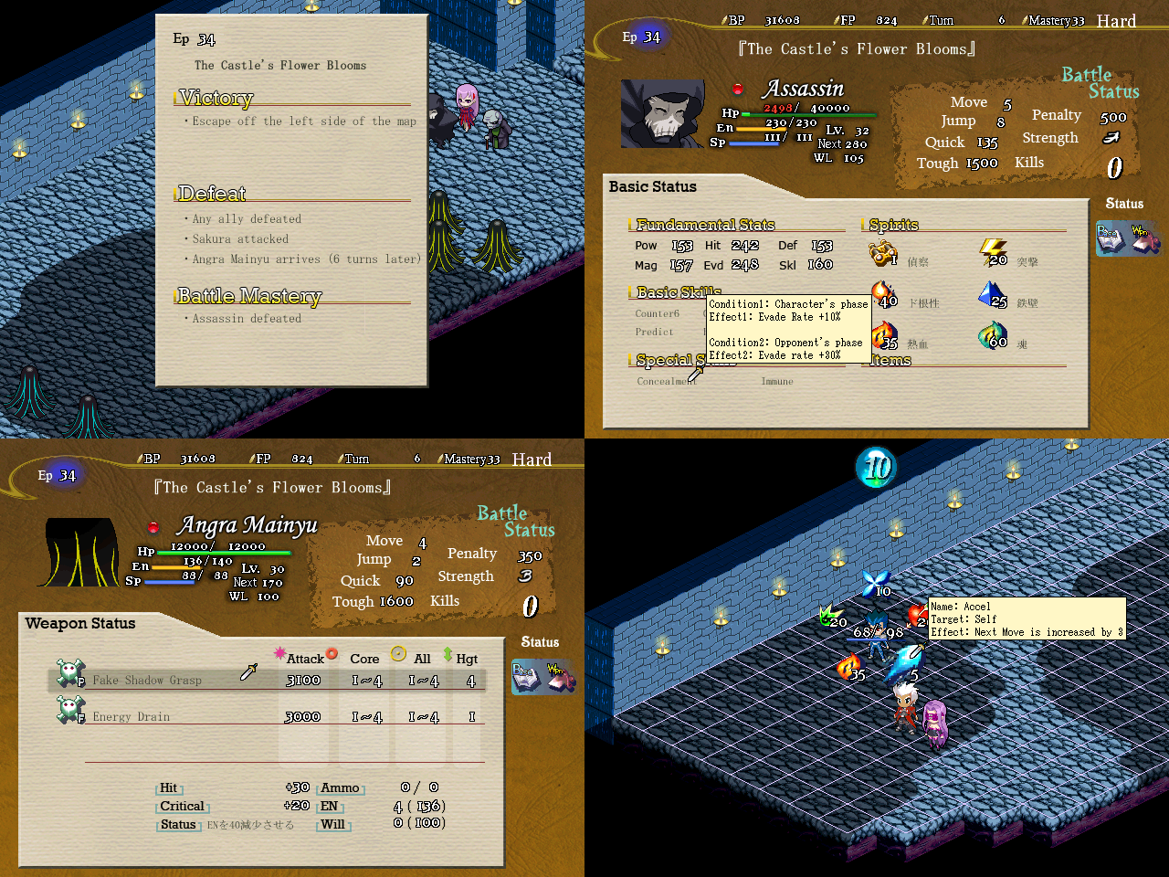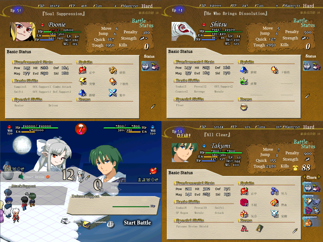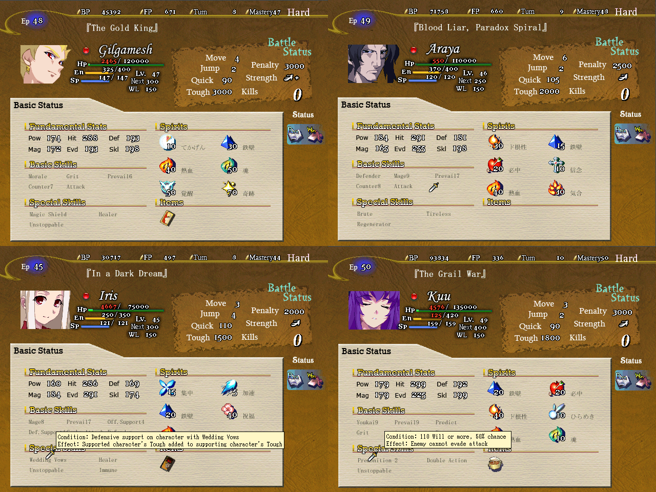 Но есть неприятные баги. Первый вообще не критичный- саппорт-атака в игре в принципе работает криво: считается, что юнит, совершающий саппорт атаку, бьет не со своей клетки, а с клетки юнита, проводящего основную атаку. Второй ОЧЕНЬ КРИТИЧНЫЙ- после победы в финальном 51 эпизоде игра просто закрывается, причем и на семерке, где я ее проходил первые два раза, и на десятке. Никакие совместимости не помогают, сам я этот момент всегда проскакиваю на старом компе с ХР (возможно, сработает и на виртуальной машине с ХР)- только надо учесть, что для нормального шрифта игре нужна поддержка японского языка в системе, которого в ХР по умолчанию нет, если его при установке не добавить. Третий обходится геймплейным абъюзом: в финальном бонусном 53 эпизоде Сэйбер Лили хреначит площадной атакой, и если в радиусе ее действия никого не окажется, она ее запустит в молоко, а игра вылетит с ошибкой. Очевидно, надо просто держать под ней персонажа с высоким уворотом и сохранять перед концом хода, чтобы загрузить, если он вдруг огребет. Но я в этот раз убил ее еще до того, как она стала по площади бить.