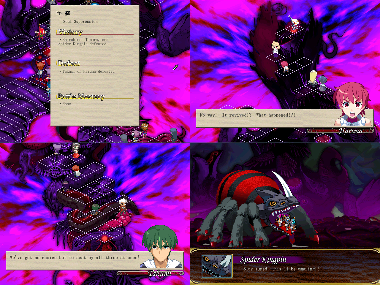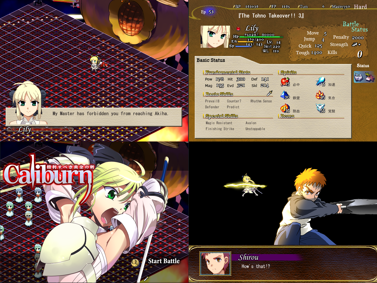 51 глава в игре уникальная. В ней одновременно три разных боссса в разных частях карты, но если убить только одного, он на следующий ход воскреснет с половиной ХП. Надо в один ход завалить всех трех. Когда знаешь- дело техники: уворотчики идут мочить шпарящего атаками по площади паука, владеющие атаками с приличной высотой скачут лупить мелкую хрень наверху, а тяжеловесы спускаются бить злобную девочку. Ну а потом Шики с Реги, Сэйбер, Арквейд и Харуна дружно лупят вытащенного Илией дьявола (который оказался просто шаром дерьма), а Такуми окончательно разрубает, как ему по статусу положено.