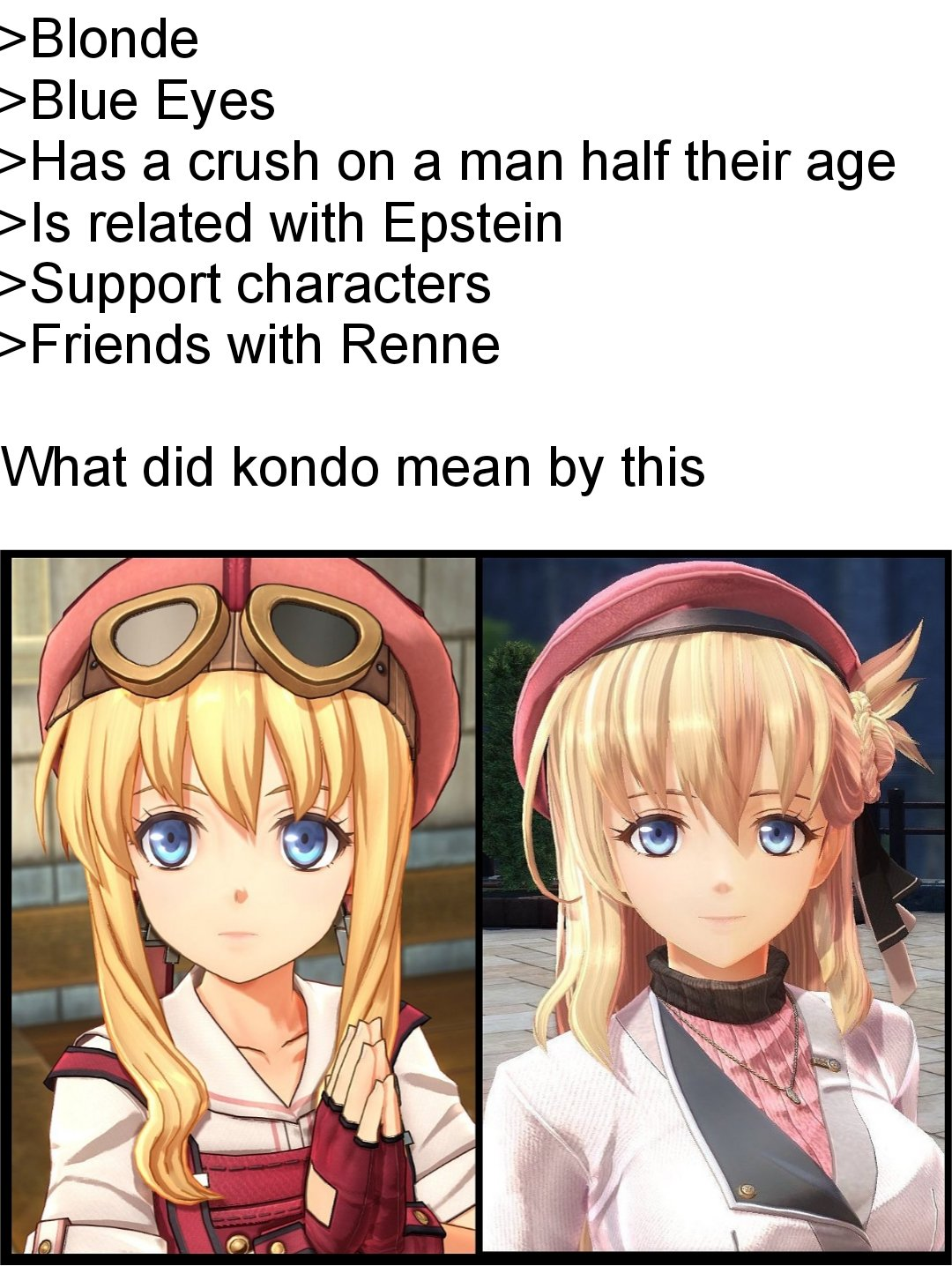 >>50273366 В Скаях 1-2 гг это Эстелль. Так что картинка уже не верная. Нету Риес Аргенты. Никакого любовного интереса у Ллойда нет, он на Кроссбелле женат. Максимум можно притянуть Риксию(прям сильно-сильно-сильно притянуть), с которой он вместе чегеварит по пампасам, пока Эли приняла судьбу и строит карьеру при новой администрации. Алису забыли прописать вайфой Рина, теперь у него личный гарем, где он может подкатывать к кому угодно, от милф до малолеток. Ну а что там в новых Кисеках я не знаю, ибо сгорел от Хаджимари у желание играть дальше пропало.