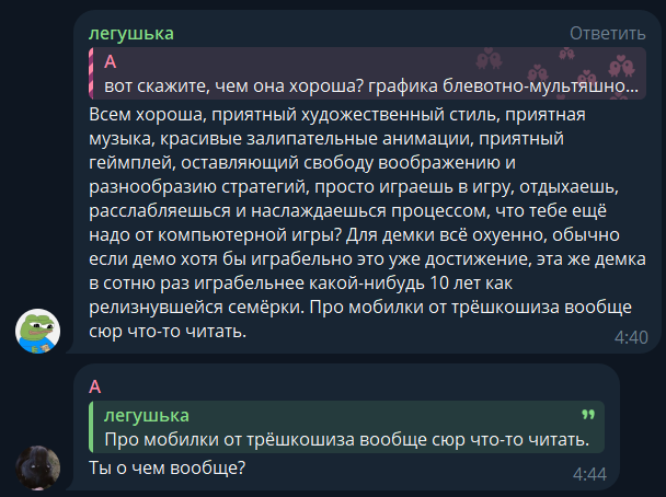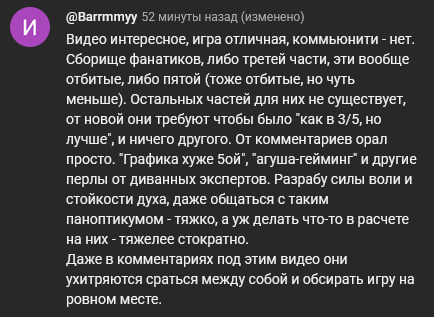И ведь в камментах реально какая-то тётка допустим расписывает насколько ей противна игра и тут же моментально подскакивает боевой карлик обзывая её трёшкошизом и т.д. по списку, на что она местами разумно возражает пикрил.