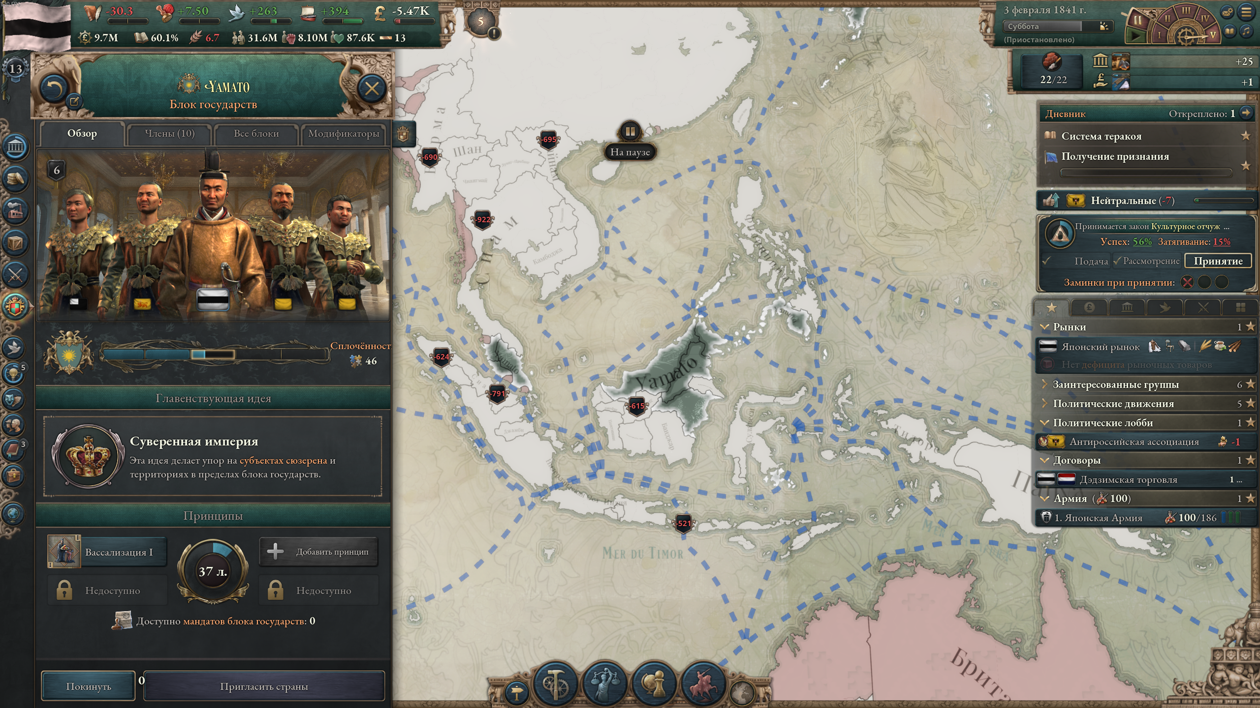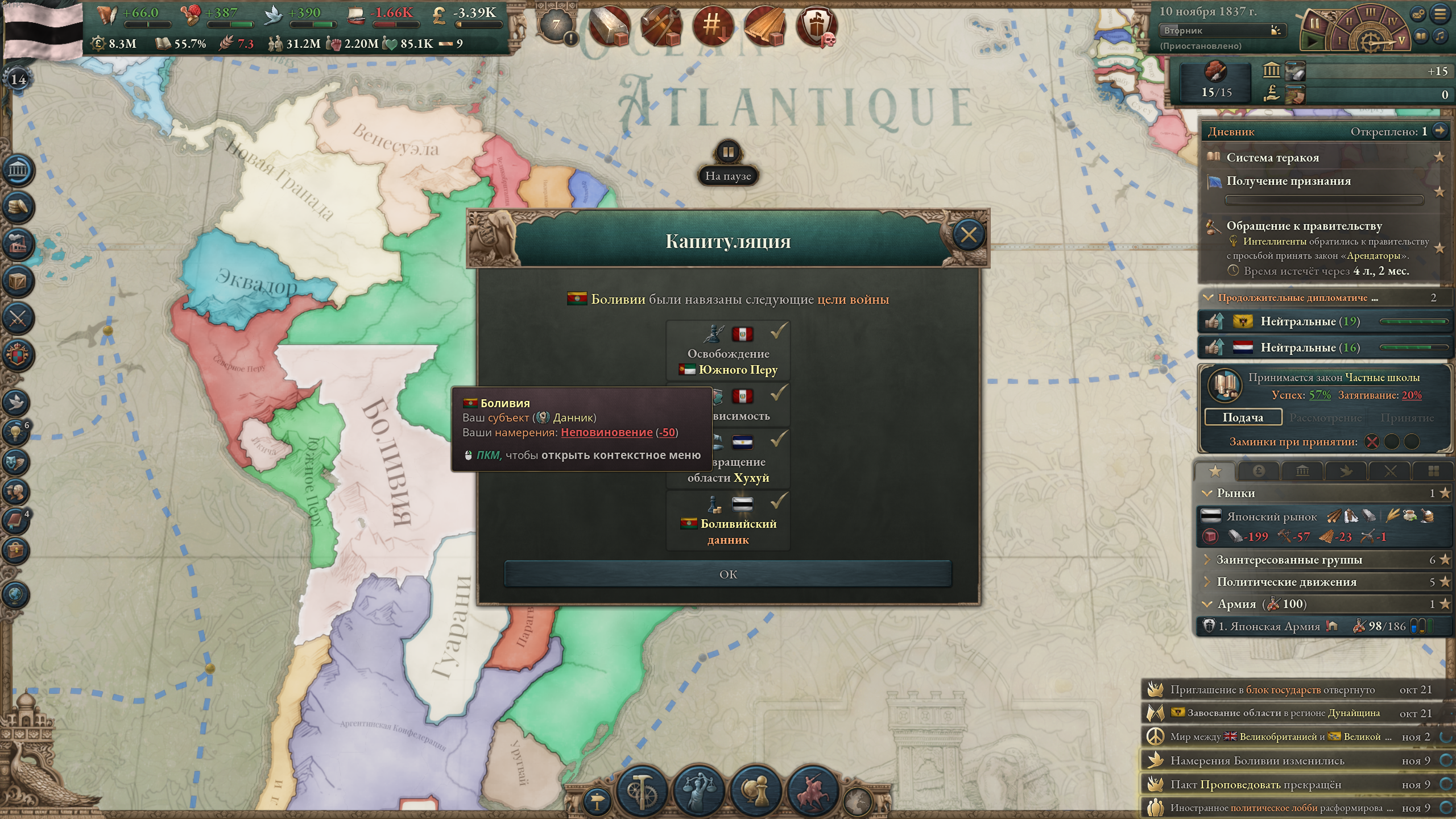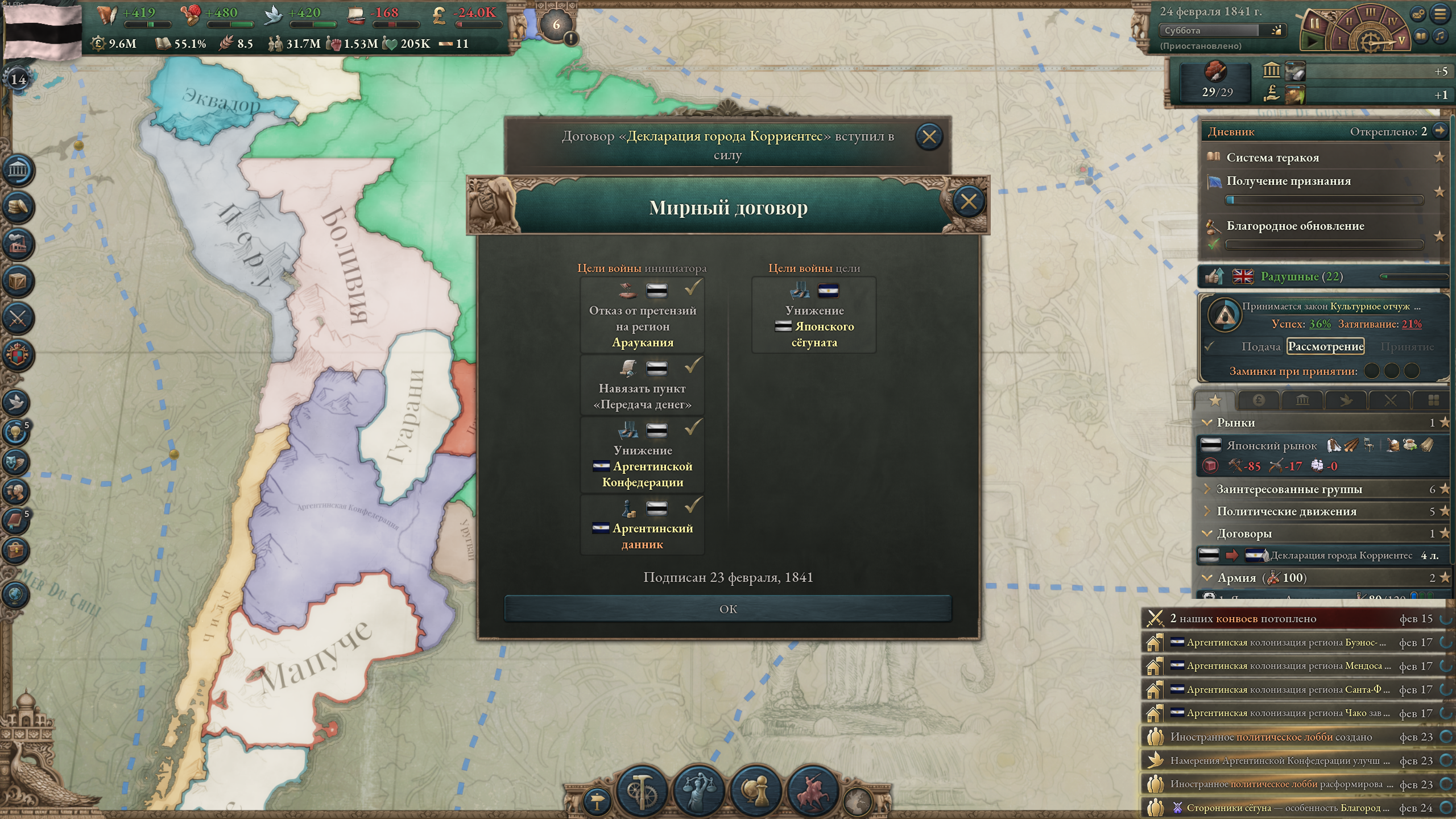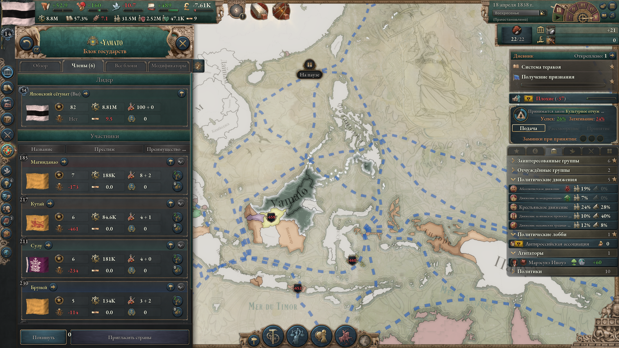 >>50197929 Какого еще влияния в 1838 г.? Нет, просто объявил войну по причине "сделать данником", добавлял все дополнительные цели типа унижения и торговых привилегий, а под конец мобилизовал войска — все сдались. Пока что девять лохов струсили и сдались, буду целиться в Сиам и Дайнам.