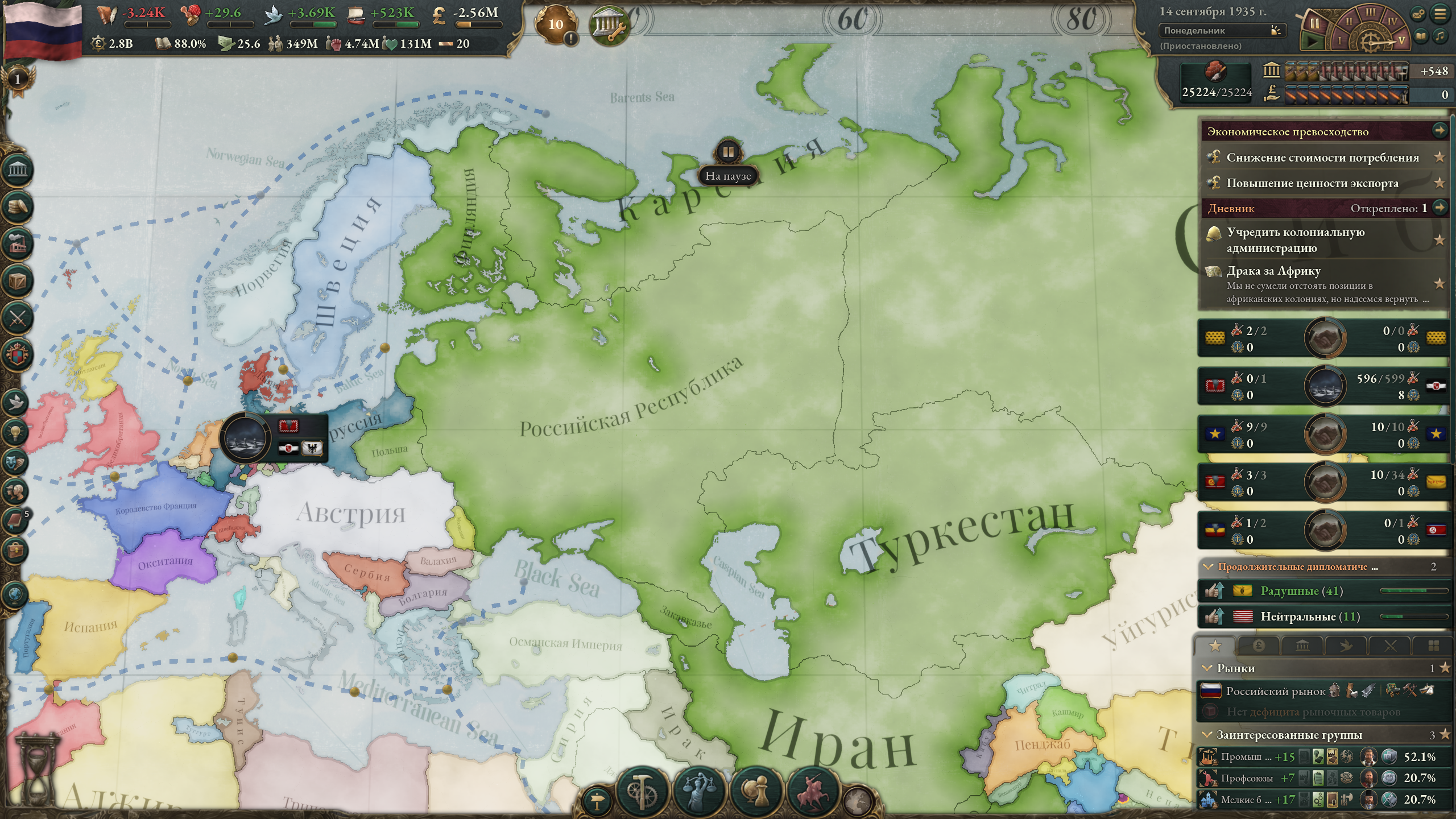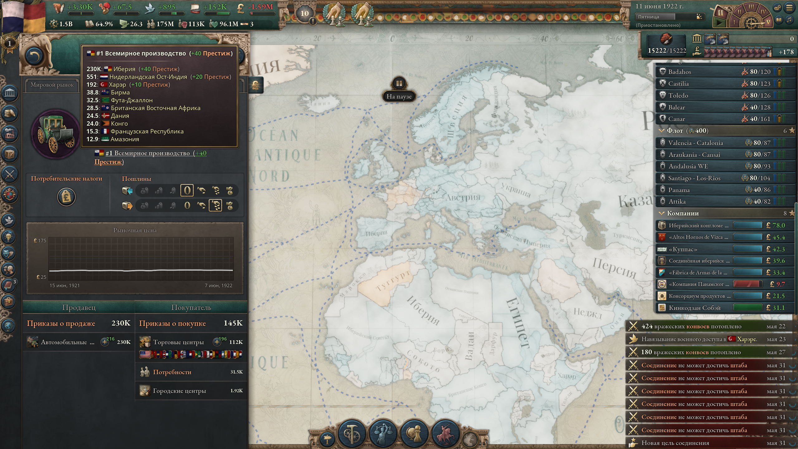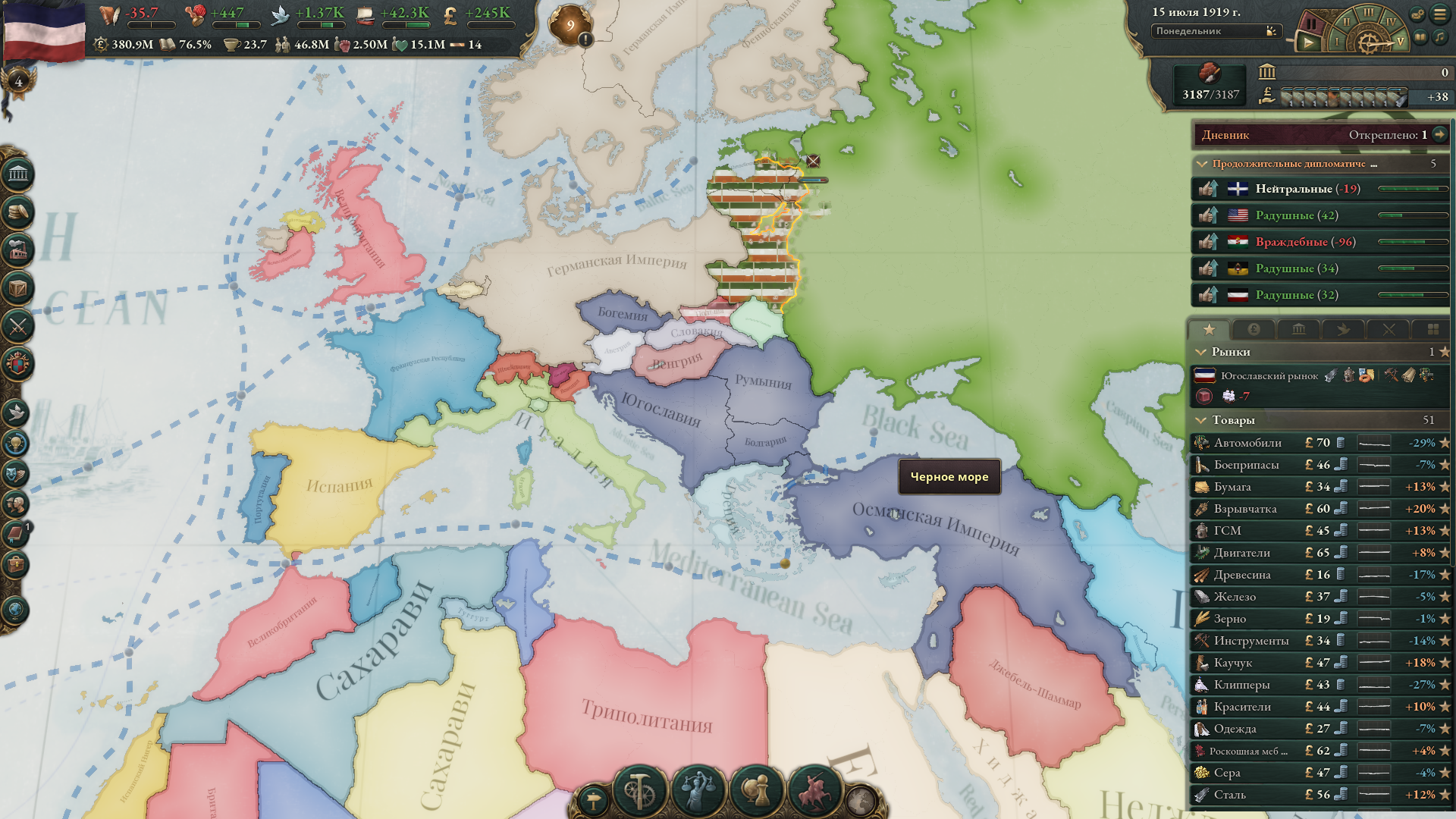 Меня скорее интересуют махинации с рынком, поскольку, как ты мог заметить, на скриншоте у меня огромный минус, но это из-за того, что я въебал максимальные субвенции на все роскошные товары, из-за чего фактически узурпировал мировую торговлю. Бедные американцы тоже пытались въебать субвенции на автомобили, но слились через некоторое время и их производство развалилось. Без субвенций ввп падает на несколько сотен миллионов, как минимум.