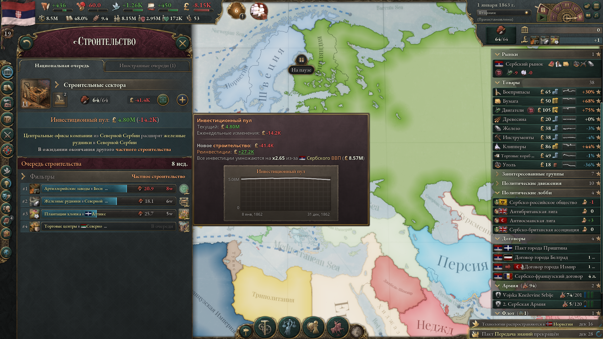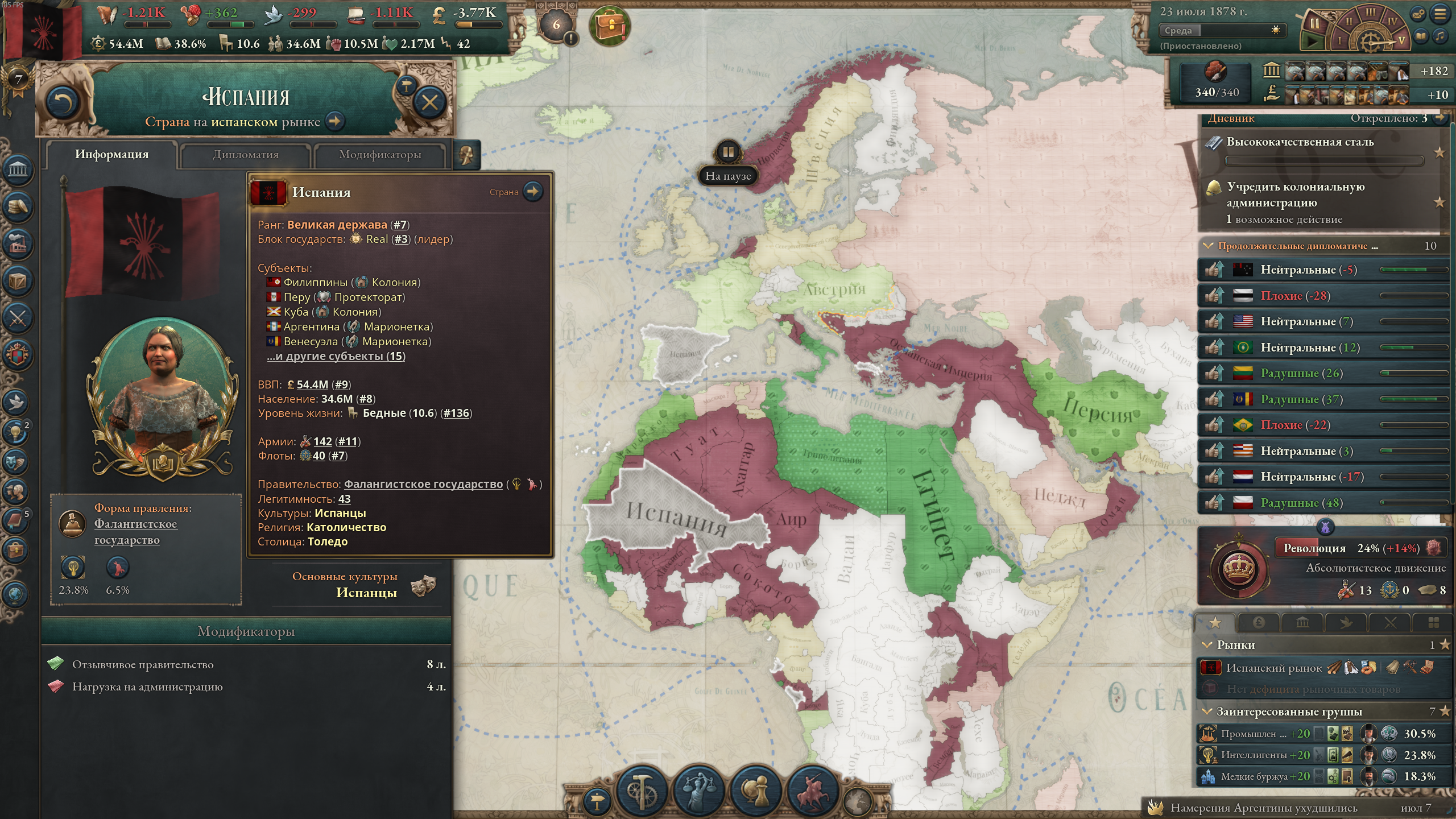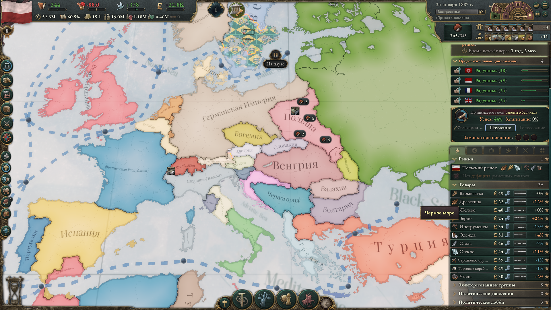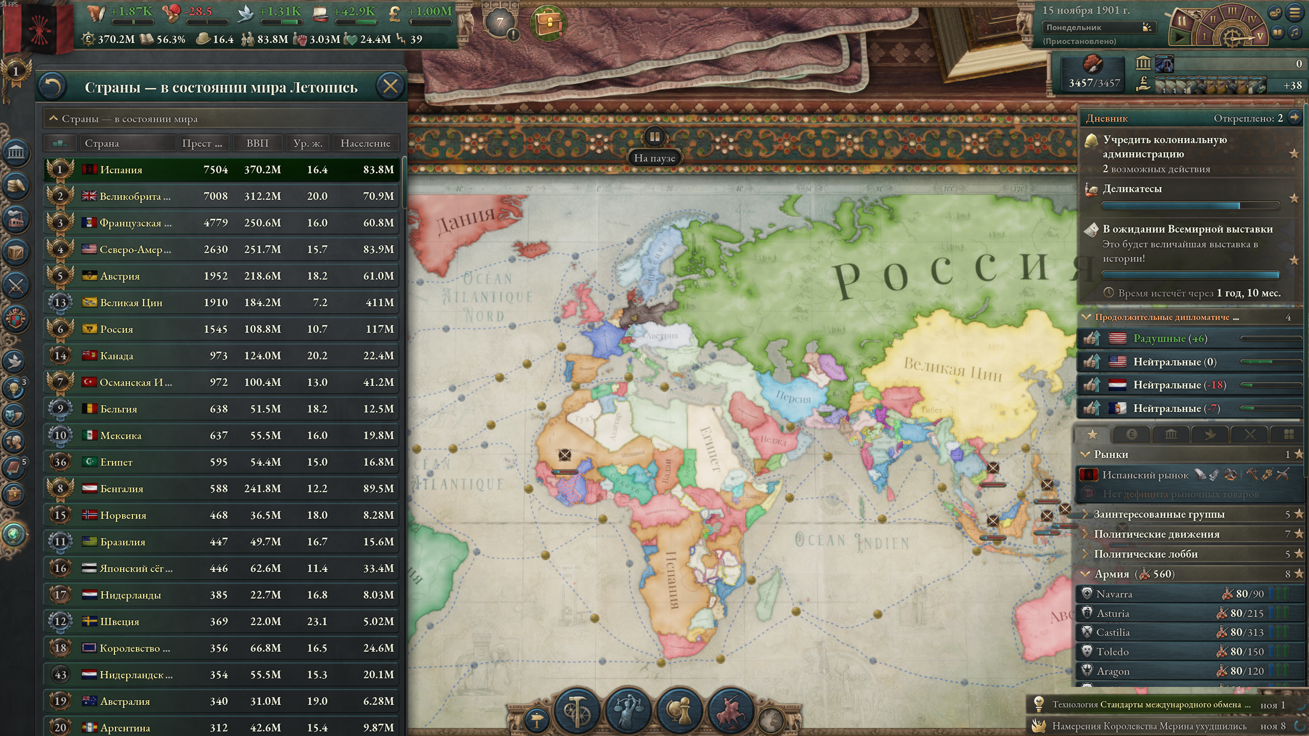 Меня скорее интересуют махинации с рынком, поскольку, как ты мог заметить, на скриншоте у меня огромный минус, но это из-за того, что я въебал максимальные субвенции на все роскошные товары, из-за чего фактически узурпировал мировую торговлю. Бедные американцы тоже пытались въебать субвенции на автомобили, но слились через некоторое время и их производство развалилось. Без субвенций ввп падает на несколько сотен миллионов, как минимум.