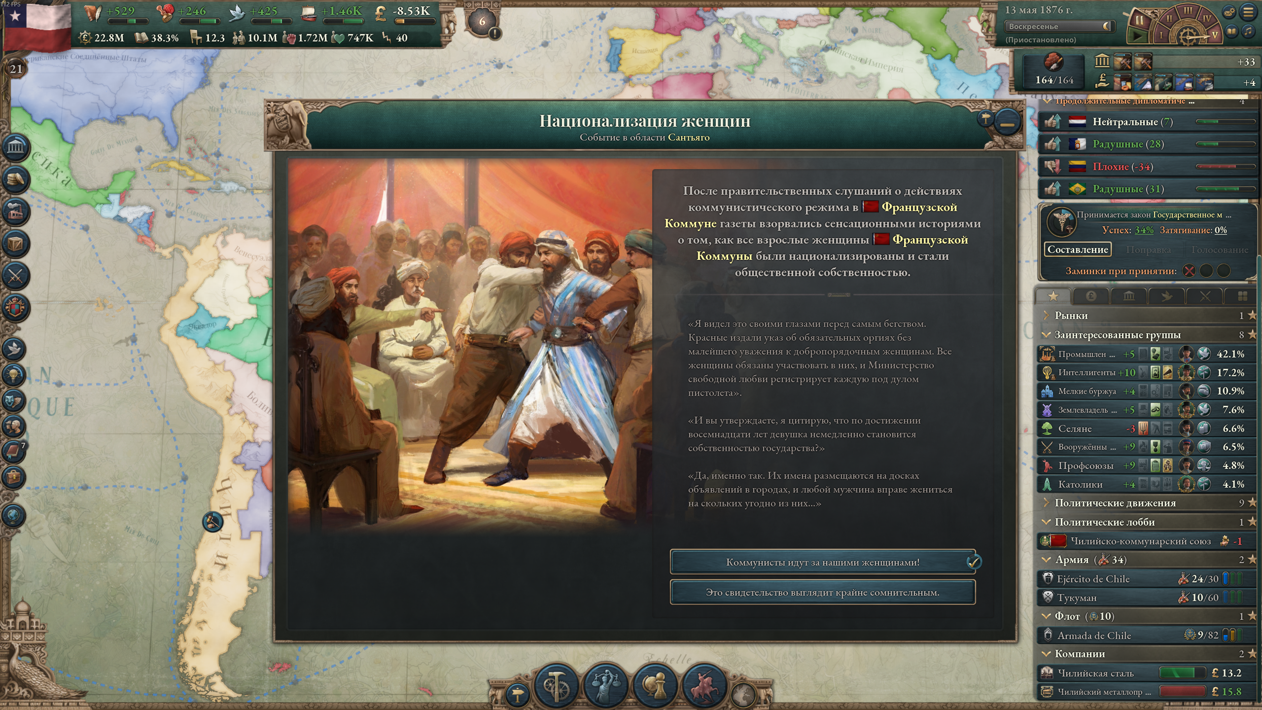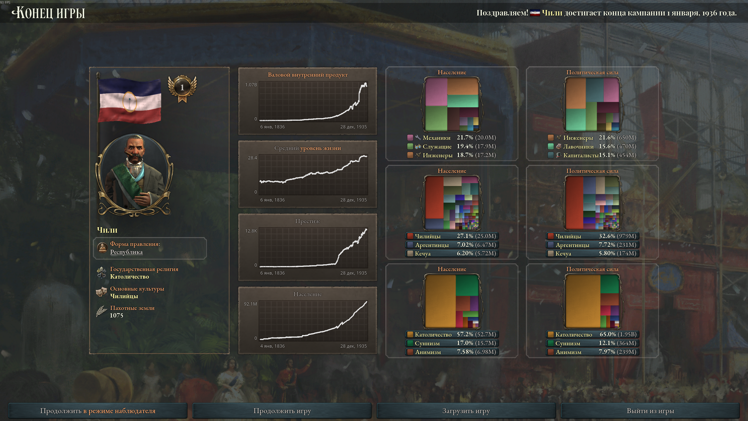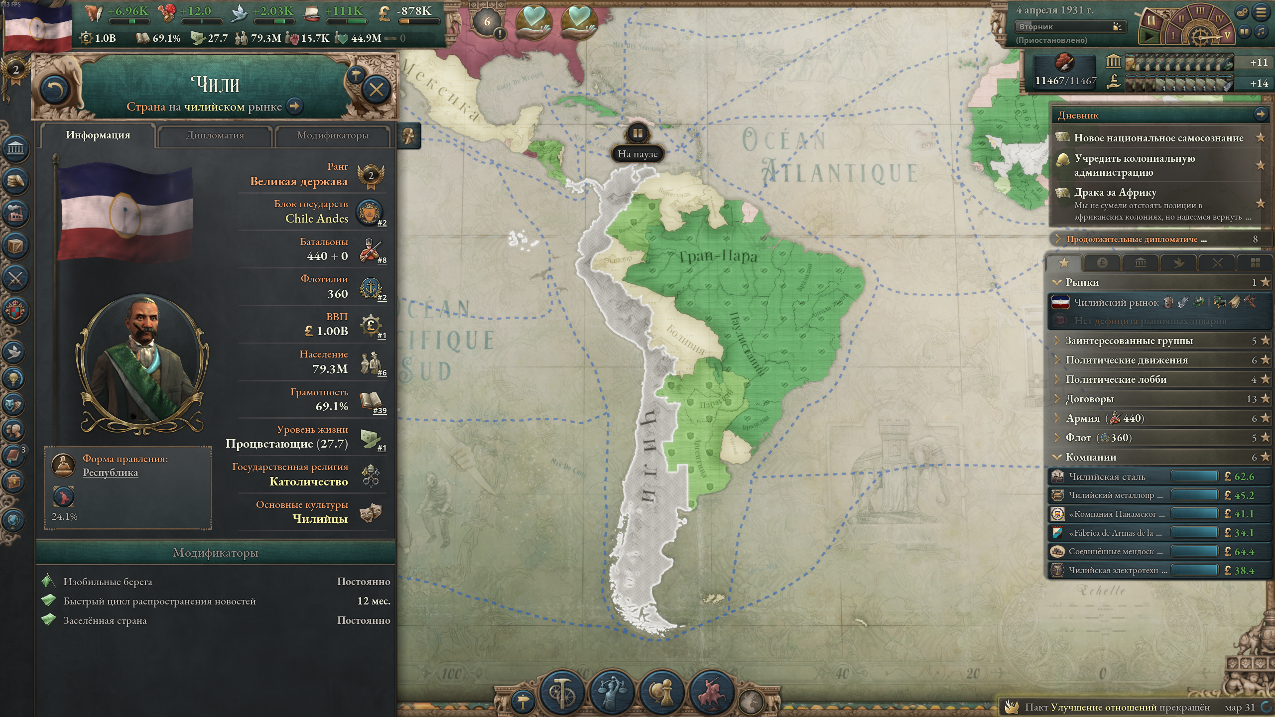 За андские Чили прикольно играть. Разок обанкротился, мультикультурализм принимал десять лет (и принял только к 1910 г), постарался со всеми дружить. С мажорами вообще не воевал.