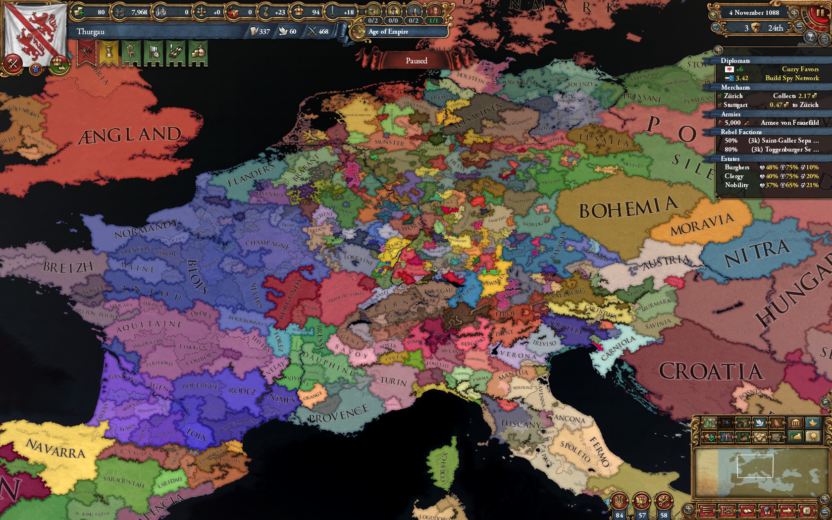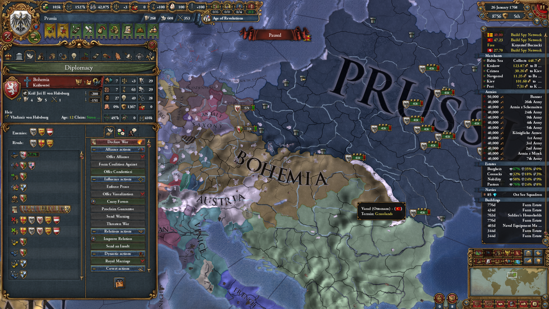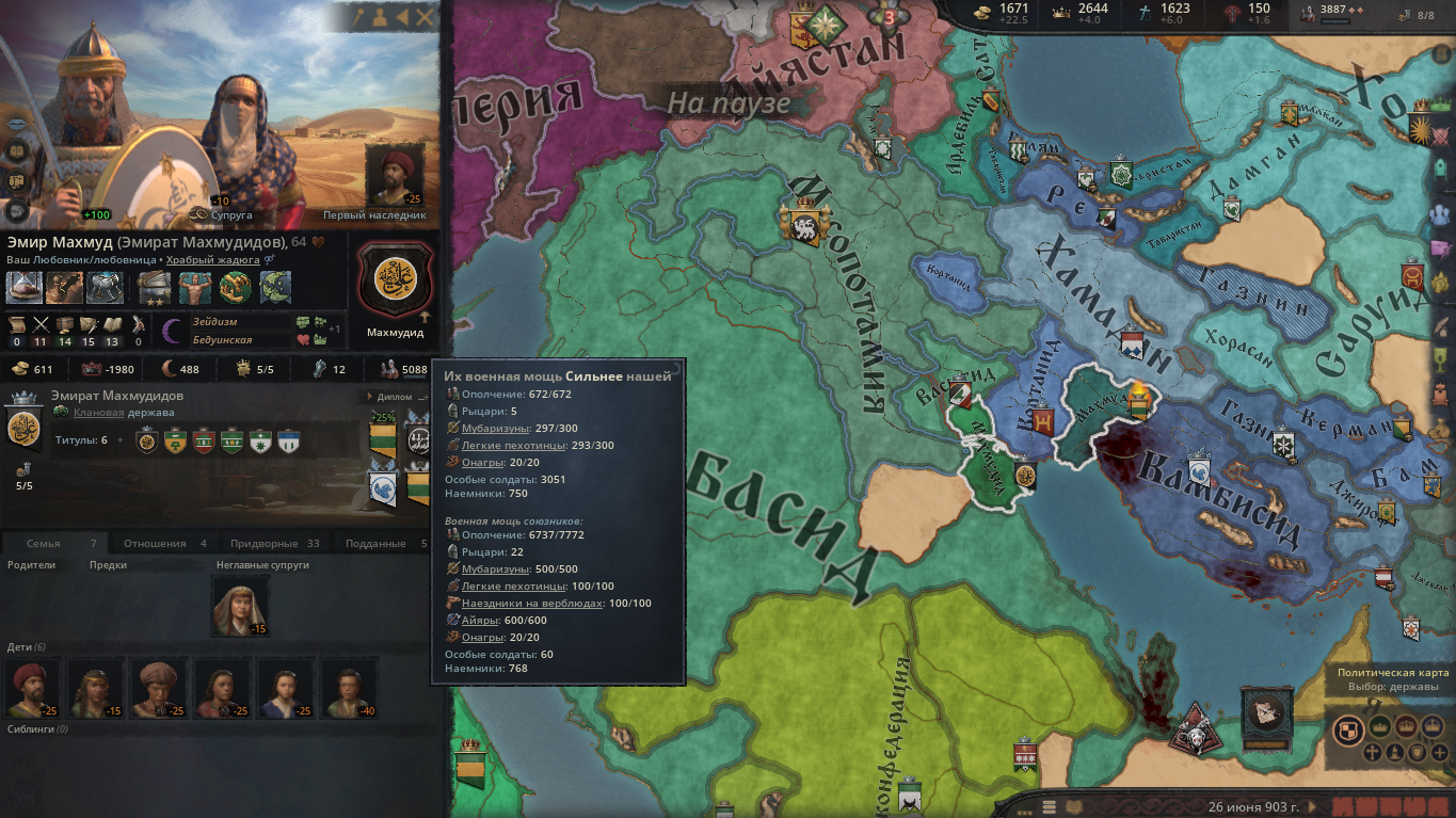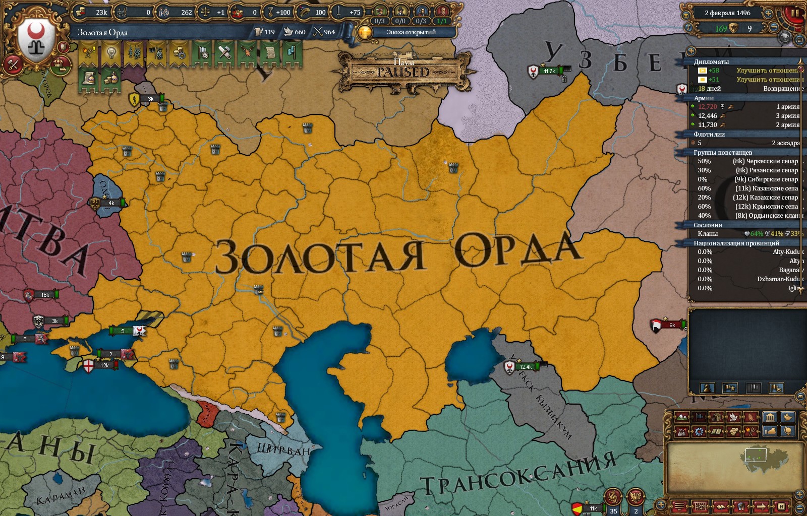 Возродил улус Джучи за 50 лет игры. Москва разорена как во времена Едигея, в этом помог союз с Польшей и Литвой, которые взяли на себя основной удар, а мои тумены методично брали крепости. На юге медленно набирают силу османы, но есть надежда стравить их с мамлюками. На востоке серьёзных соперников нет, я их превосхожу по техам и количеству.