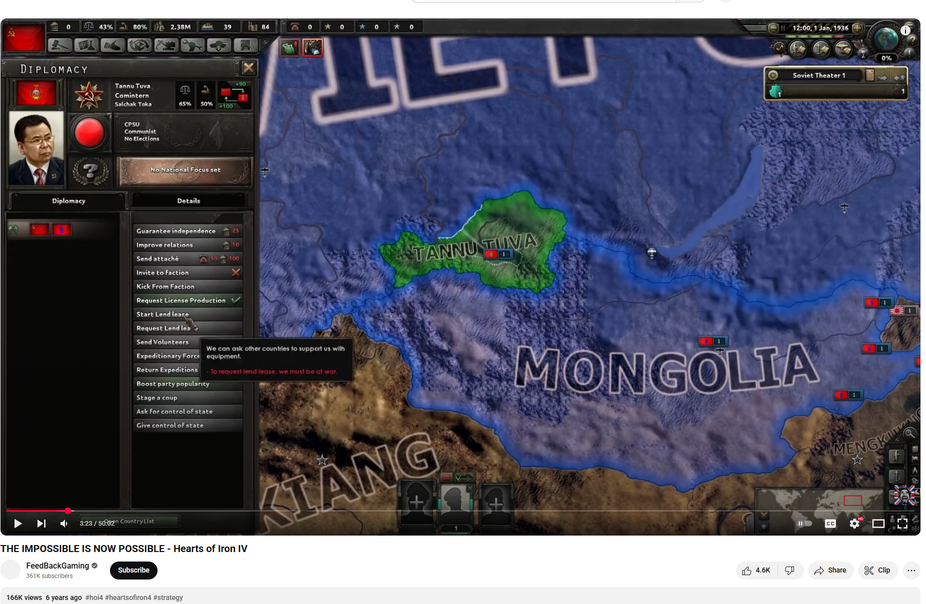 >>50207644 >тува раньше со старта была марионеткой совка. Было так или нет? Не было. Всегда была независимым государством которое по ивенту присоединялось к СССР в каком-то году. Причем ивент есть буквально с первых версий игры.