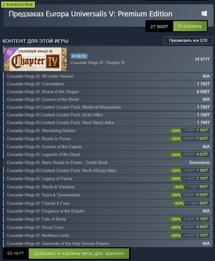 Crusader Kings 3 (867–1453 гг.) — средневековье. Детально проработанные религии и феодальная система. В данной игре игрок руководит не страной как таковой, а персонажем и династией со всеми их проблемами. Ключевую роль играют личные навыки вашего персонажа и его взаимоотношения с другими персонажами.