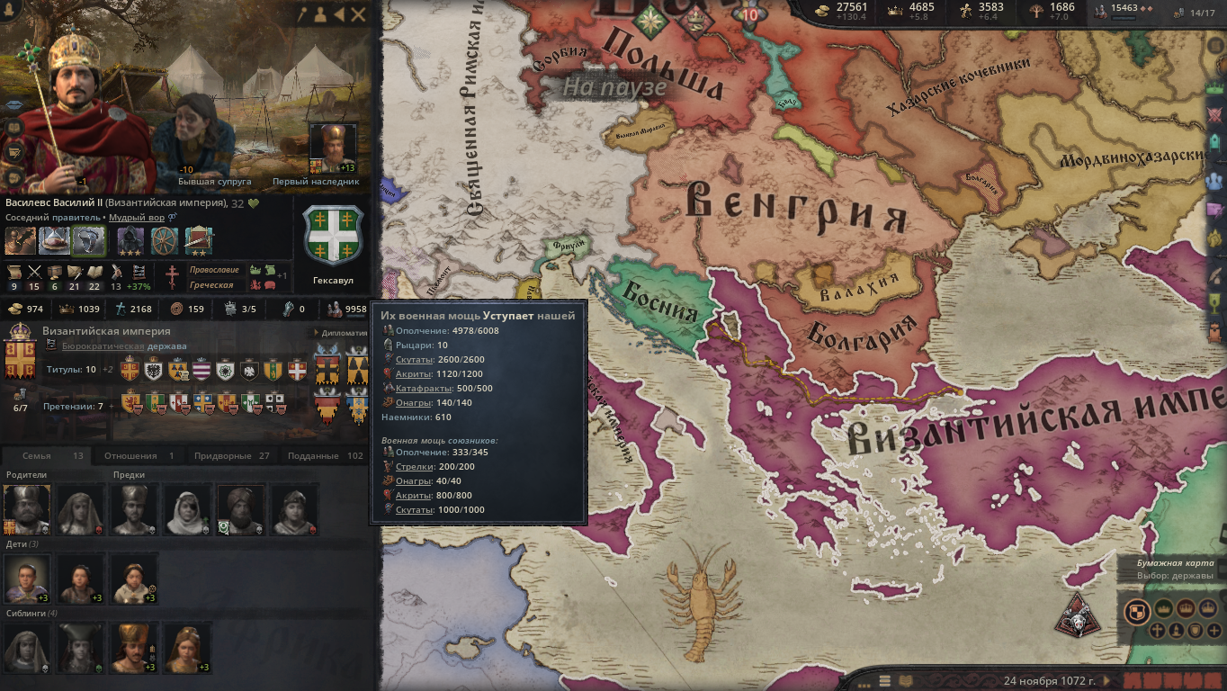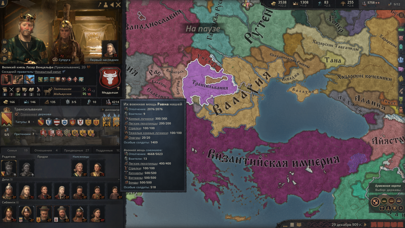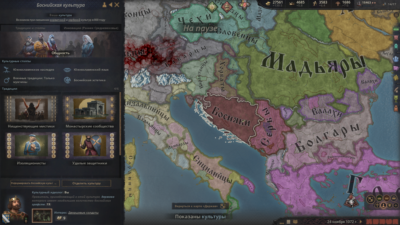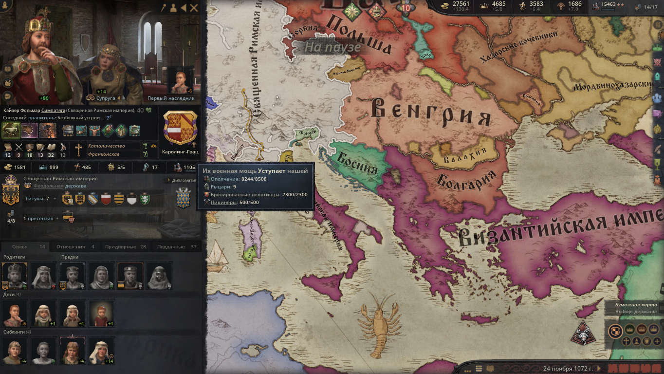 >>50261015 >>50261433 Короче, я решил не рисковать и прогнулся под карлана, дальше ему объявили войну одновременно папа с священным походом и хазары за данничество, и он потерял трейт завоевателя. Воспользовавшись ситуацией я создал фракцию разделения и уже он сам на удивление прогнулся и империя распалась. Но теперь другая проблема, я тупо не могу никого захватить так как окружен со всех сторон. С одной СРИ на балканах, с другой византийцы которые продолжают быть шнырями хазар, ну и венгрия которая просто каким то образом после разделения снова соединилась и мб какой-то правитель снова получит трейт завоевателя. Что вообще сейчас делать кроме застроек собственного домена?