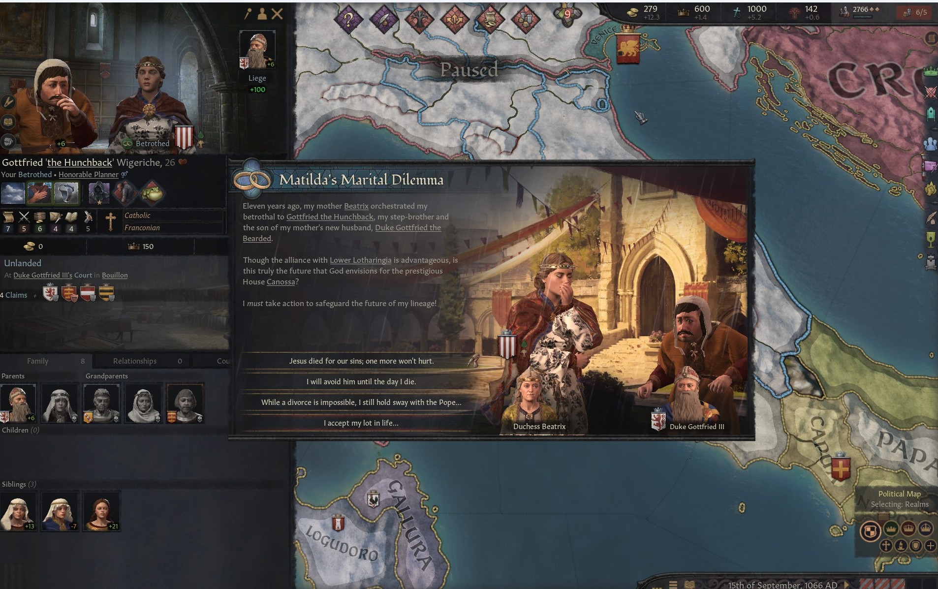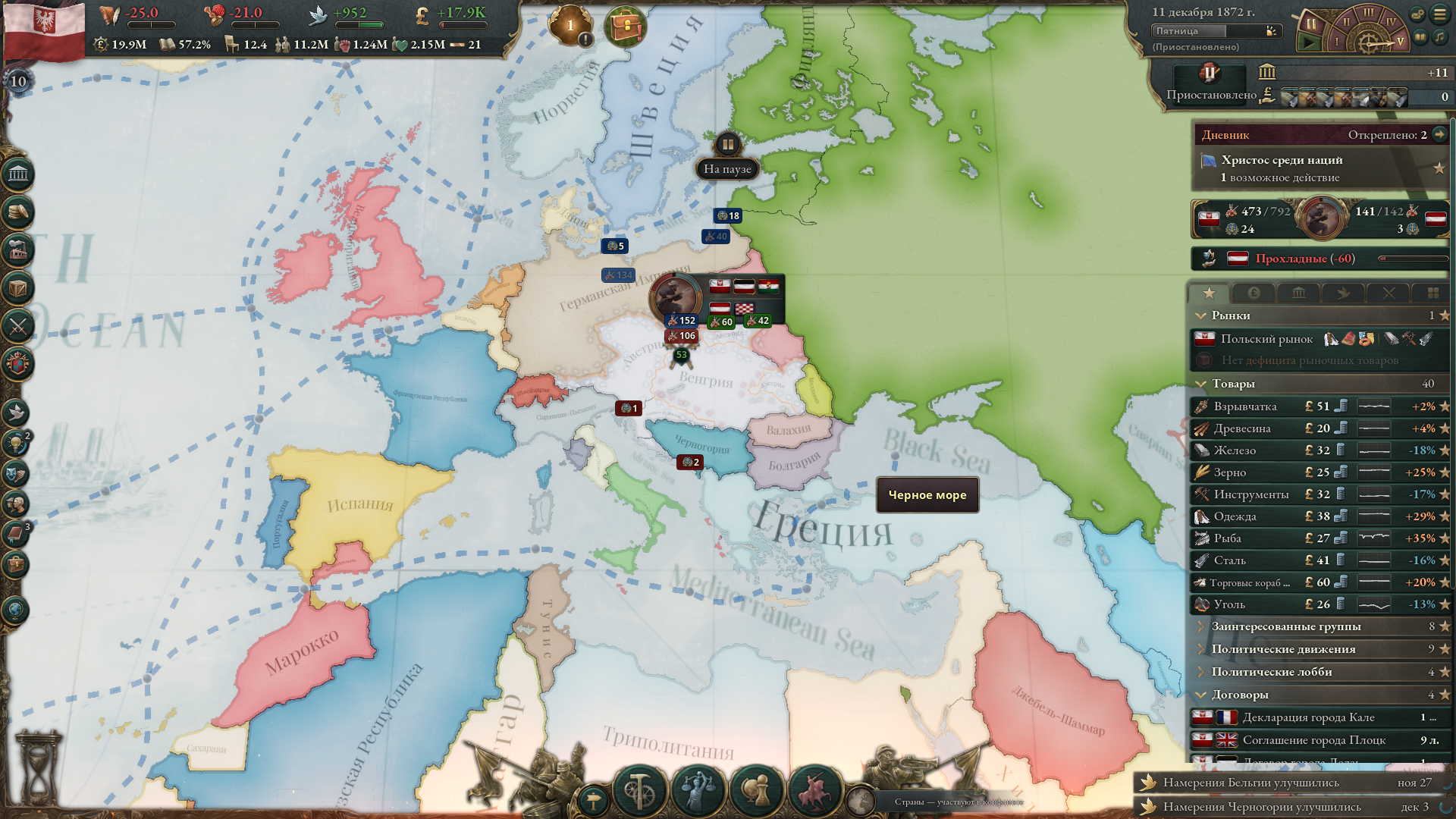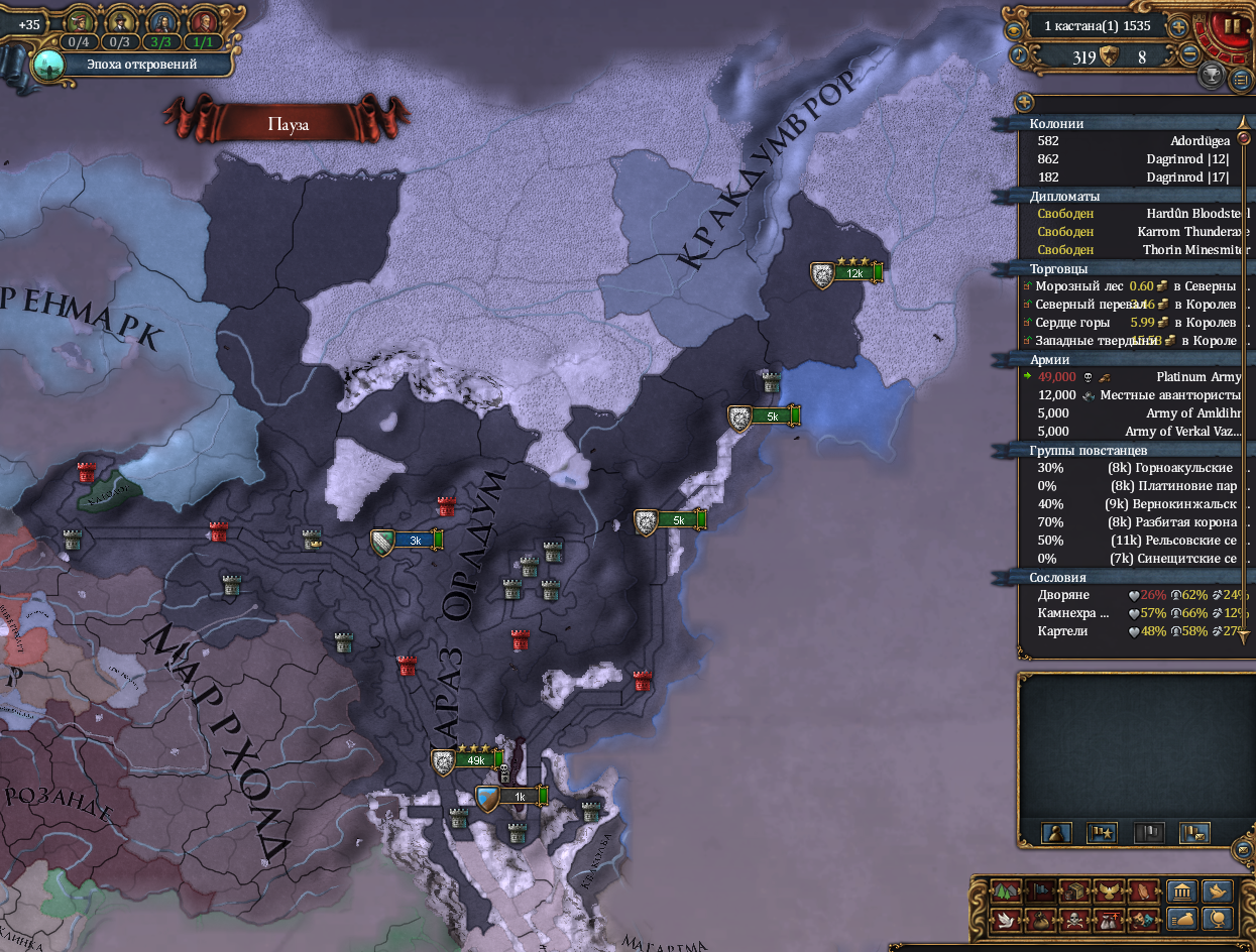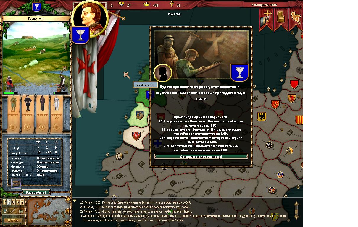 >>50261015 >>50261433 Короче, я решил не рисковать и прогнулся под карлана, дальше ему объявили войну одновременно папа с священным походом и хазары за данничество, и он потерял трейт завоевателя. Воспользовавшись ситуацией я создал фракцию разделения и уже он сам на удивление прогнулся и империя распалась. Но теперь другая проблема, я тупо не могу никого захватить так как окружен со всех сторон. С одной СРИ на балканах, с другой византийцы которые продолжают быть шнырями хазар, ну и венгрия которая просто каким то образом после разделения снова соединилась и мб какой-то правитель снова получит трейт завоевателя. Что вообще сейчас делать кроме застроек собственного домена?