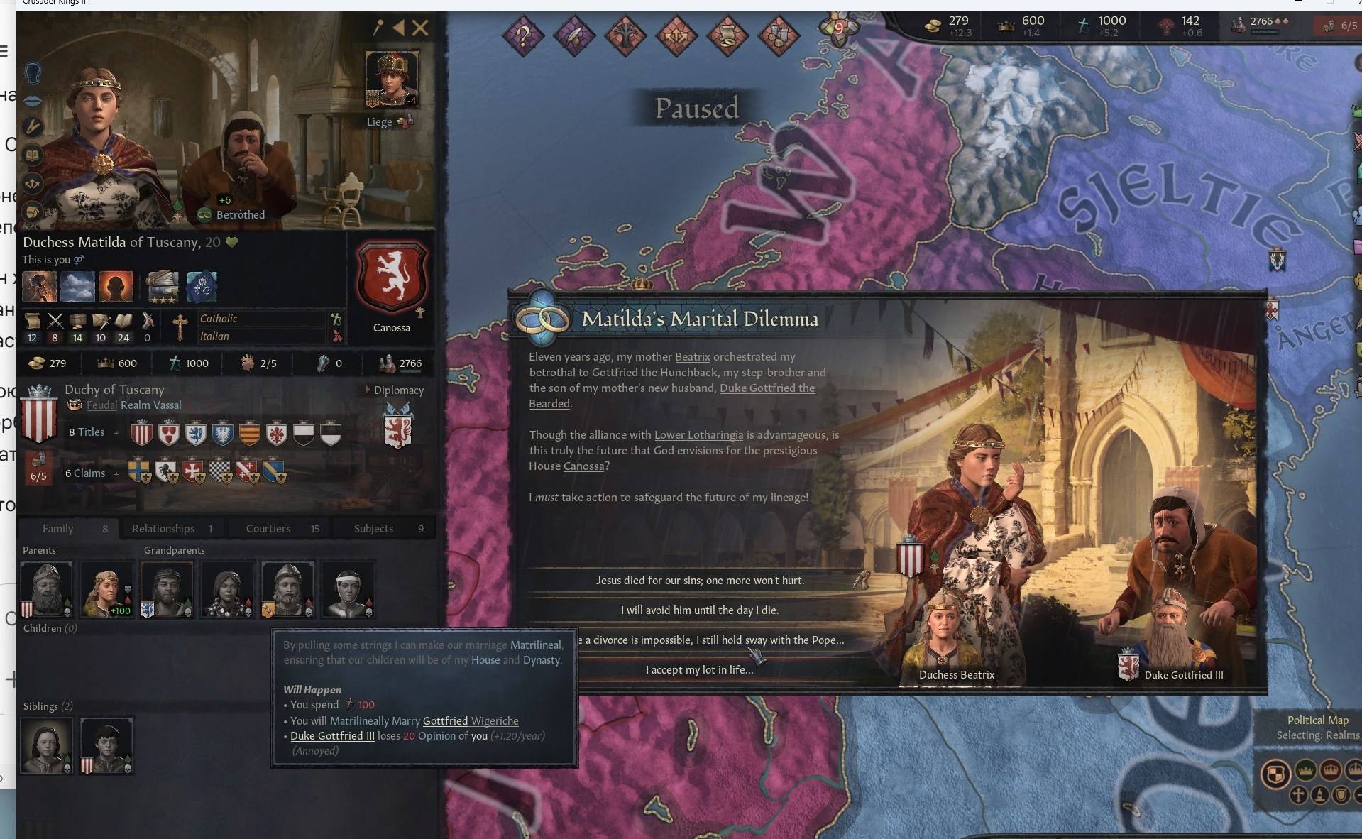 >>50191211 Так у нее вторая дочь очевидно есть, она ее отдаст замуж матрилинейно, и династия не прервется. И вообще, в этом случае у отов есть минусы согласиться на брак, если что. Младшую дочь она отдаст более охотно, чем старшую. Просто видимо у тебя модифкаторов много, вот она и соглашается.