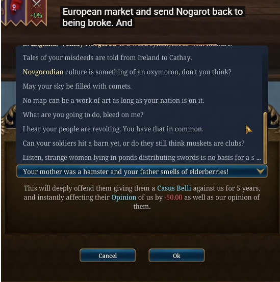 >>50186890 Зависит от целей. Для покраса карты военка будет самой лучшей офк. Ситуативно на первом персе можно взять ученость т.к. есть перк на покупку претензий (это быстрее чем ждать пока пока священник оправдает цель войны), ну и права на титул сюзерена, а потом религия реформится с уменьшенной стоимостью от перка в третей ветке в какую ни будь чтобы можно было просто сразу кидать захваты на соседей (причем на герцогства/королевства) и остальные персы уже чисто на военке c бафами на рыцарей по фасту все красили. Еще более имбовым было бы стартовать за безземельного с ученостью. Там по мимо выше описанного можно набрать себе шесть отрядов любой элиты любой страны, которая если с ней ничего не делать останется у тебя даже после становления лендлордом причем с оверлимитами, плюс за 30-40 лет можно сковать столько артов и получить столько денег что просто пиздец. Но мне картку красить еще со времен длс мужчины и его новой огромной пушки в хуи 4 надоело...