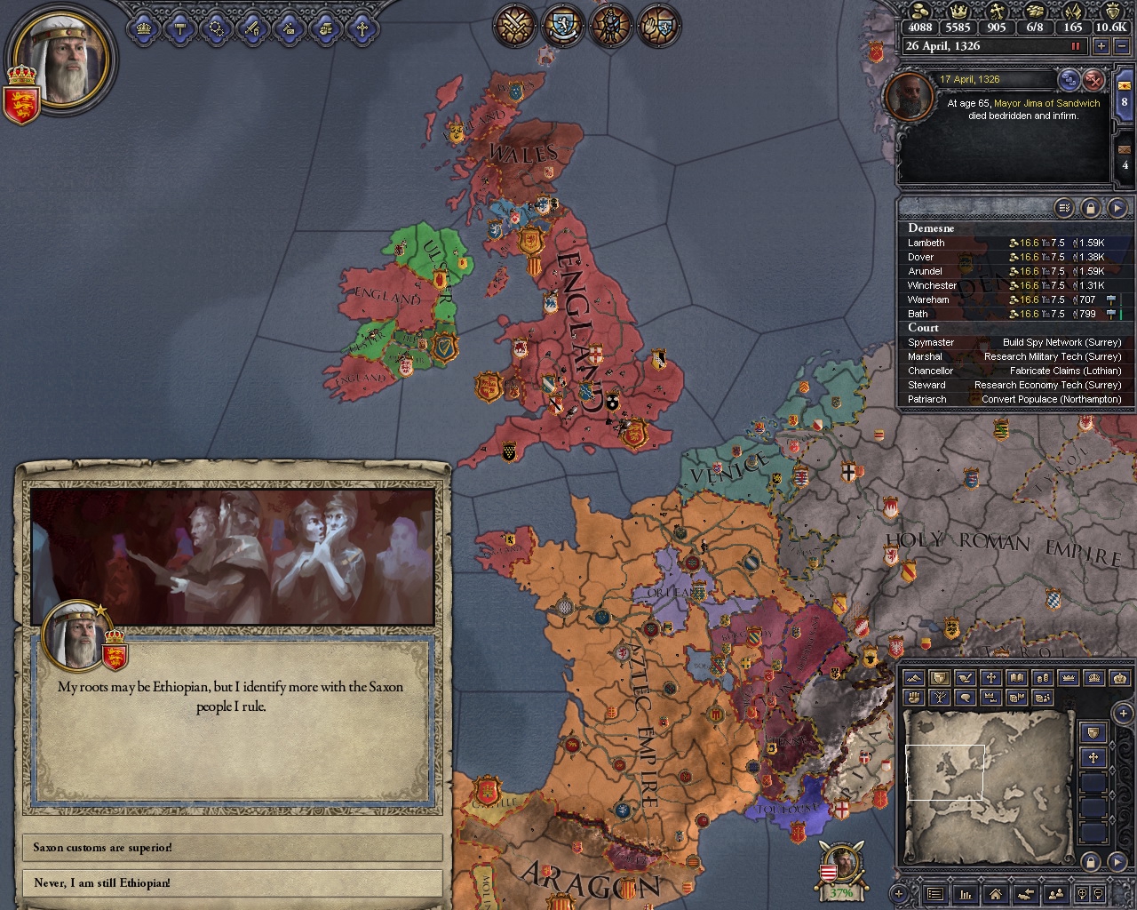 Стал мелким королём Фризии, провёл свою первую самую дешманскую и самую простую коронацию на которую хватило денег, но бонусов и модификаторов насыпали прям от души, прям заебись. Доволен. Еще и артефактов чуть сыпанули. А это самая простая самая дешманская коронация.