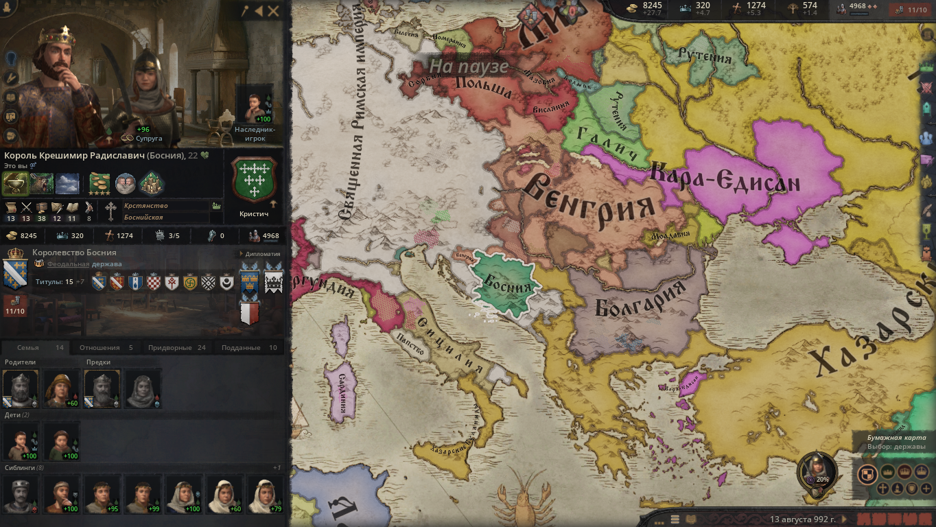 >>50262323 За вассала сербской Рашки, потом откололся и начал понемногу собирать королевство. У меня только одна провинция де-юре не входит в состав королевства, все другие исключительно в границах Боснии. Другие просто не успел захватить.