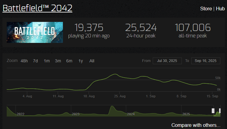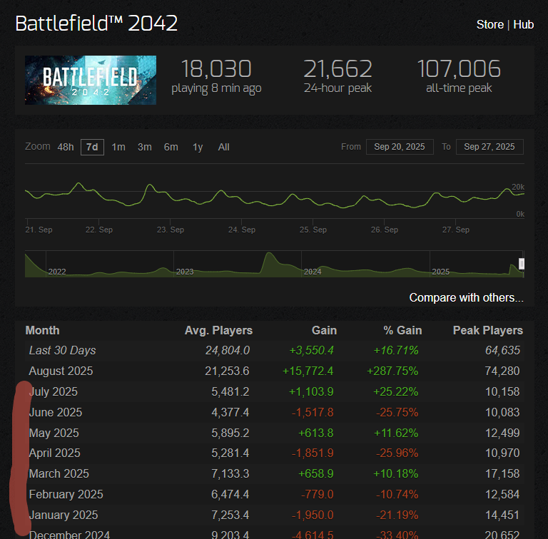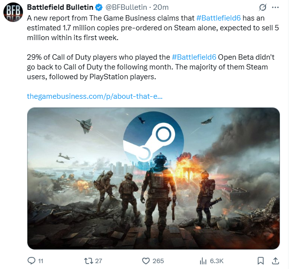 >>50251746 >А откуда там полно игроков 10-20-30 левелов? Еапидоры довольно часто делали скидки в этом и прошлом году и старые части можно было за $5 с премиумом купить. Плюс, на волне бф6-хайпа много залетных пришло.