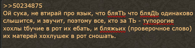 >>50234640 >Тот факт что быдло массово неправильно пишет не означает что так писать правильно, это лишь означает, что быдло так массово пишет. Ты быдло? Ты вообще в курсе, как меняются правила русского языка из-за повсеместного устоявшегося употребления слов? Че ты хуйню несешь? Люди выбрали писать БЛЯТЬ - это их выбор. Точно так же как если бы ты усирался про одноврЕменно и одновремЕнно