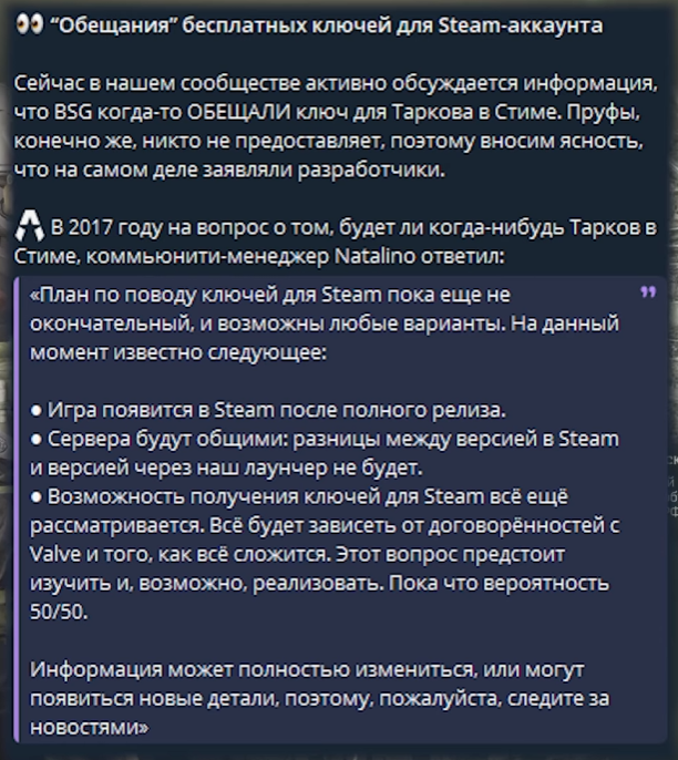 🟠На релизе в PvP-режиме будет два персонажа: сезонный, с вайпами и безвайповый. По словам Никиты, они будут стараться делать каждый вайп уникальным, предлагая новый опыт игроку; 🟠В сюжете будет 4 концовки. По мнению Никиты, самую лучшую концовку смогут получить лишь 2% всех игроков; 🟠Все локации, кроме Эпицентра, будут закрыты на релизе. Игроку придётся открывать их постепенно, продвигаясь по сюжетной линии. Такое решение также поможет замедлить общую прогрессию; 🟠Важной частью релизного патча станет глобальный ребаланс: планируется переработка системы навыков и модификаторов; 🟠Некоторые механики хардкорного вайпа перейдут в релизную версию игры. Например, планируется оставить 50% спавн боссов; 🟠Линейку квестов «Тест-Драйв» упростят на релизе; 🟠1.0 будет раем для новичков — в игру добавят «полезные функции», которые помогут ньюфагам вкатиться в игру; 🟠Без баб — в игре не будет женщин ЧВК, только NPC; 🟠На вопрос о переработке Маяка, которую считают худшей локацией в игре, Никита ответил: «тебе просто нужно стать лучше»; 🟠После релиза игру будут поддерживать ещё как минимум пять лет; 🟠На данный момент у BSG есть запас по контенту для Таркова на три года вперёд.