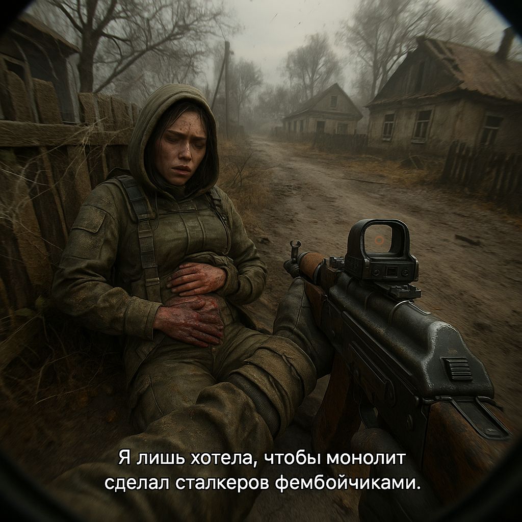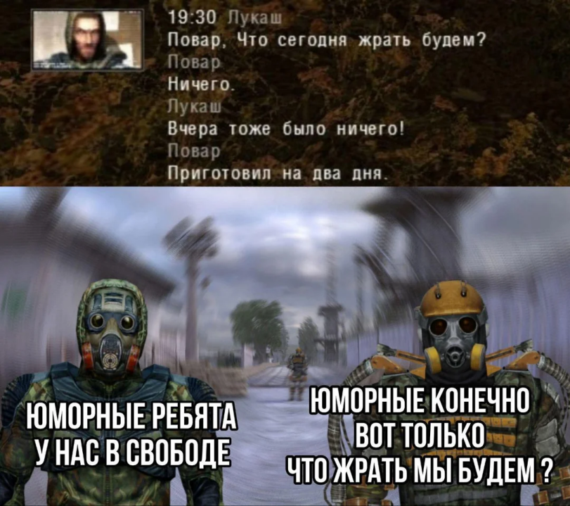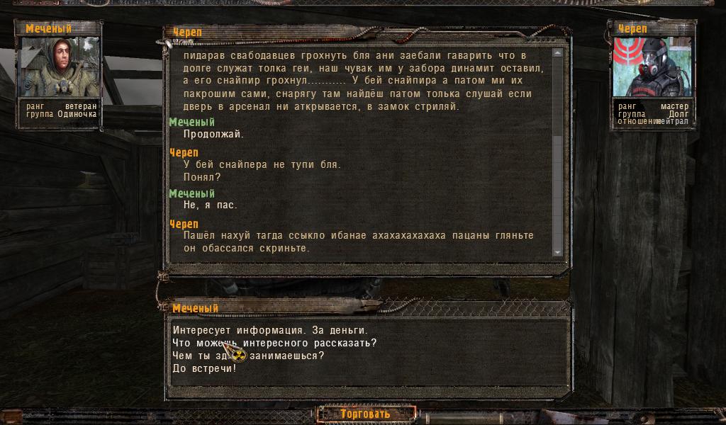 Помните, как в пидорасовских модах было: чел с бабкой базарят в подвалах на свалке, а тот достаёт уберпукич драбавик и просто нахуй, ёпта, расхуяривает бабку в пизду, ёпта, блять, нахуй, сука. Во клоунада была конечно. Зато сталкер типа, ага.