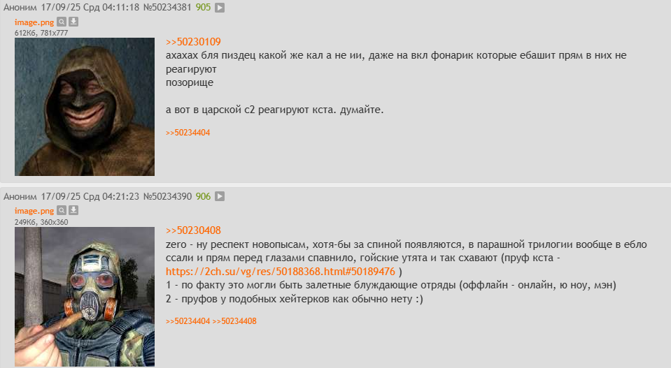 Напоминаю, что тред сталкера на сосаче состоит из: Григаплотей - постоянно кидаются на любую критику сталкера 2 им. жени хрюкоровича(становятся едой буквально для всех, да и вообще их забыли спросить). Бюреров-храуфагов - сидят в своих немытых подвальчиках, кидаясь говном во всех, кто решает отойди от канонов(их шизофазии, которая каждый раз меняется) по оригинальной трилогии, особый бугурт на с2 по многим причинам, объективным и/или нет(чаще нет). Билдозомби - стёрли свои 3см приборы на дрочке билдов, пытаясь найти суть ТСС(её нет, или есть?). Полтергейсты-отрицалы - пикируются с бюрерами, им не нравится всё, что есть в с2, но ничего не делают, чтобы показать как надо по их мнению(которое как жопа, есть у каждого). Новопыс-отмычек - вкатились во время с2, особо мягкие становятся едой для первых 4х категорий, когда высказывают хоть что либо, что им не нравится Чады-сталкеры-ветераны - ржут с мутантской пиздобратии и идут дальше, или подкармивают фауну, когда тред загибается.