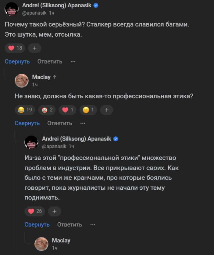 Короткая историческая справка. Во время разработки первого Сталкера Грига тоже очень надеялся на популярность на Западе. И, с одной стороны, ему не повезло, не фортануло - из-за кучи переносов, да ещё и в 2007 году, на фоне других релизов, о нем просто забыли. С другой стороны - ему очень даже повезло - вместе с популярностью в остальном мире Сталкер обошли и те скандалы, что были у нас. Так что после возвращения Григе было довольно просто присесть на уши непуганой западной аудитории: "Играли в Метро? А знаете, что еще до него была игра, которая похожа, но даже лучше? Так вот, мы делаем продолжение". И вот после повторного обосрамса семейству Григ бы приказать своим ботам замолчать и не отсвечивать - популярности своими набросами они все равно не принесут, зато лет через десять, когда про них опять позабудут, можно будет и третью часть анонсировать - внукам на карманные расходы. Но они наоборот, предпочитают позориться до талого. Вопрос - зачем?
