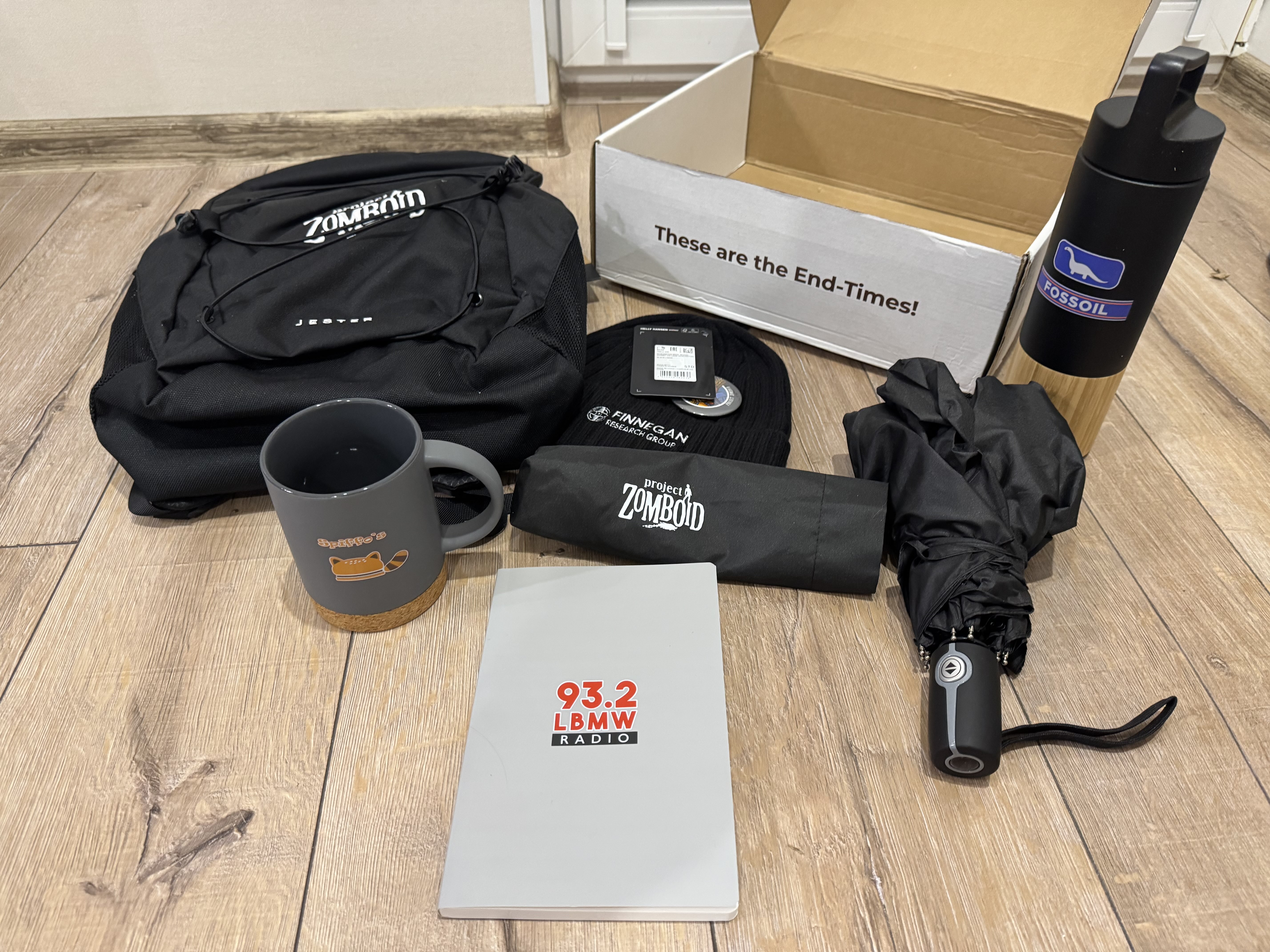 Подгон такой: 1) Зонтик с маленьким Спиффо на нём. 2) Кружка. 3) Рюкзак The North Face с лого Зомбоида. 4) Шапочка с лого какой-то компании из игры. 5) Значок со Спиффо. 6) Термос. 7) Большой толстый блокнот.