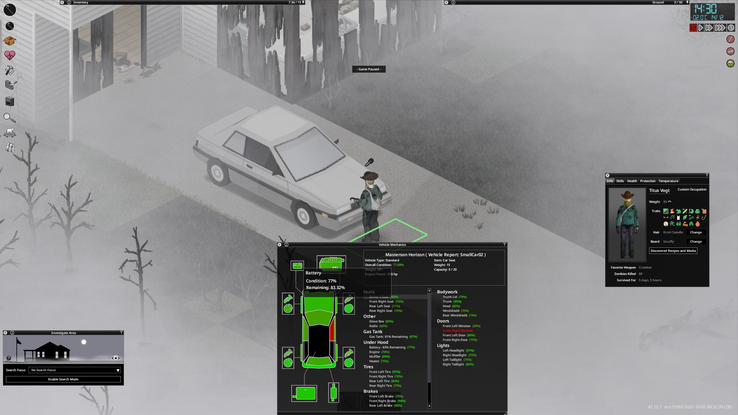 Чот как-то очень все хорошо начинается для CDDA забега, еще стартовая рана в паху не зажила - у меня уже полный набор основных инструментов из подвала и высококалорийной еды на неделю, аж толстеть начал, пока два дня сидел читал найденные первые тома книжек, чтобы с собой лишний вес не нести. А тут еще на одном зомбе были ключи от машины, я все ближайшие тачки проверил - и вот такое вот нашел с 3/4 бака и рабочим аккумом. Изначально думал железной дорогой и лесами пешком уйти в уже знакомую дачу у озера, прихватит что влезет и там жить и гриндить навыки, особенно Фитнес 5, до самой весны. Но теперь даже хз, думаю полутаюсь сколько смогу тут в округе.