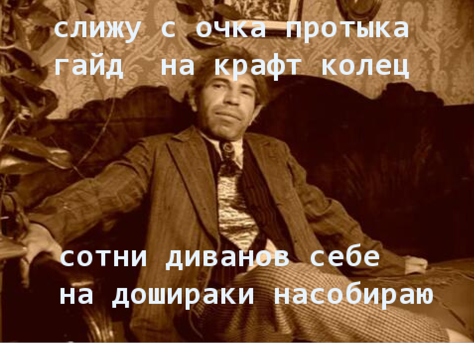 Загадка от Жака Хреско: я выбил 100 диванов и купил на на них у Васи сапоги, Вася на них купил шлем у Пети, Петя на них купил броню у меня, я на них купил у Васи амулет, Вася на них купил лук у Пети, Петя на них купил щит у меня, я на них купил у Васи перчатки, Вася на них купил молот у Пети, Петя на них купил арбалет у меня, я на них купил у Васи пояс, Вася на них купил кольцо у Пети, Петя на них купил жезл у меня. В итоге мы выбили 100 диванов, а шмота купили на 1200 диванов, помогите слабоумному гидроцефалу из треда понять откуда волшебным образом из воздуха взялись еще 1100 диванов.