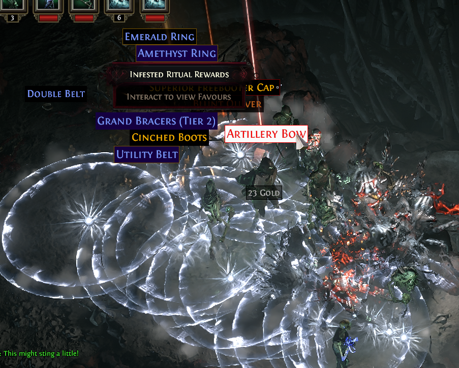 >>50252249 Два кольца пикрил и две батарейки. Один моб лопается на весь экран, из за раздутого аое и 100% крит шанса с мультом, я не помню, вроде 400%, дамаг улетает в небеса. Тупо по цепочке вся карта шотается. Очень приятно монолиты открывать, весь экран на пару сек замирает с видом на ад
