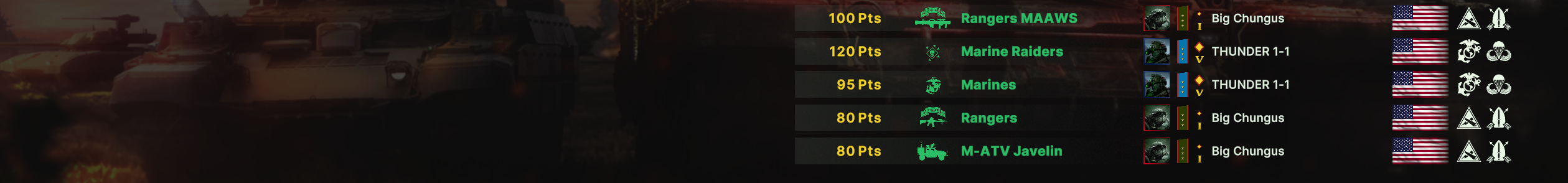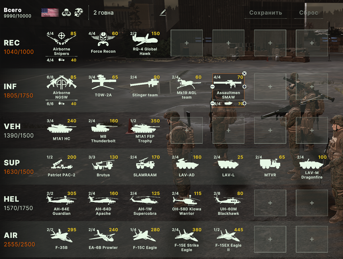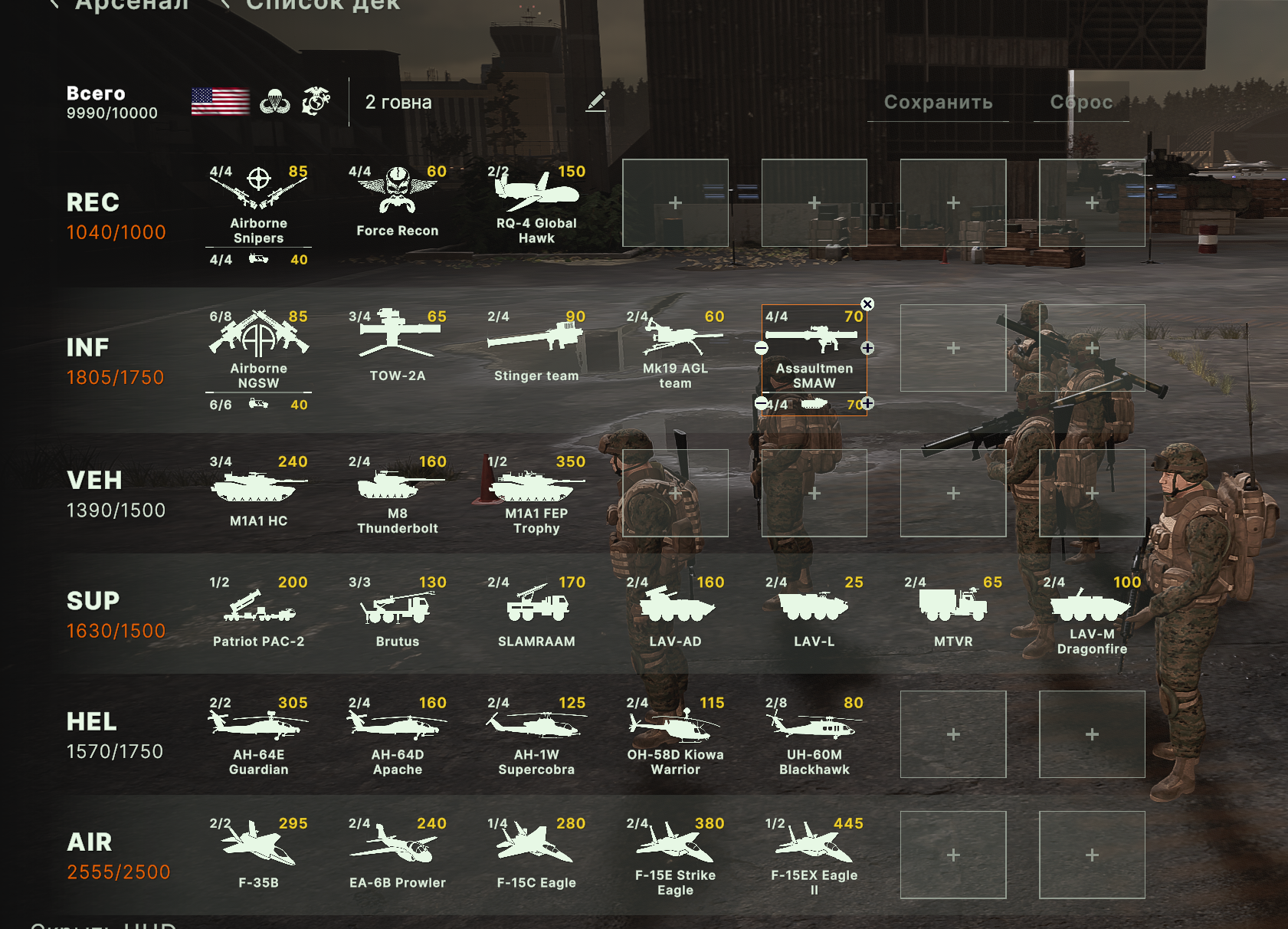 Кстати я уменьшил машинок на 3 и взял веапон сквад для открытых карт в количестве 1 шт для поддержки тоу 2а. >Хотел взять их как резерв есть аирборнов выебут всех разом Это надо постараться + у тебя на прикрытие смавы + АГЛы. А ф-15Е на чугуне это фундамент.