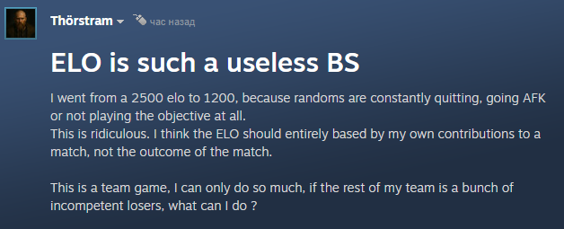 А по треду в целом - считаю что в игре нужно две очереди, рейтинговую и обычную, пусть в обычной как хотят ливают с никаким наказанием, а в рейтинговой сразу жопу отрывать после 2-3 лива на пару дней ее банить и эло спускать. Ну и не давать/снимать эло остальным, если ливают в первые 5 минут.