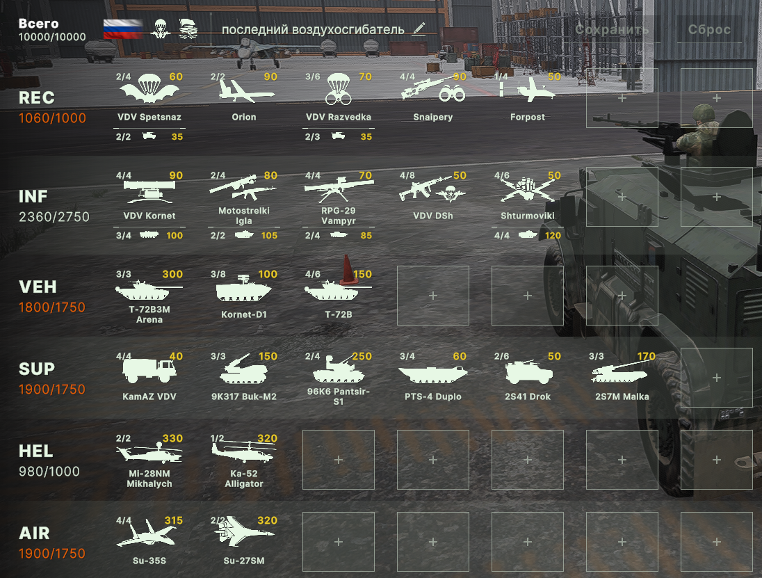 - При возврате юнита на базу, стоимость потраченного боекомплекта увеличена вдвое. Это глобальное изменение не затронет самолеты.