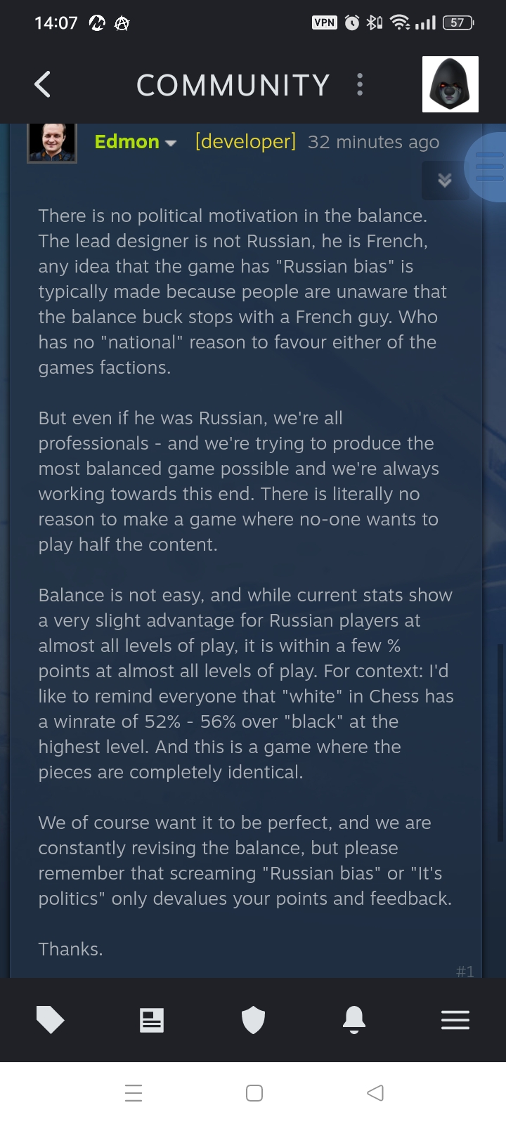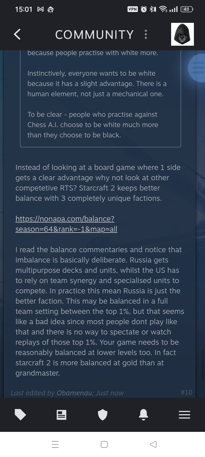 Mostly russians crying for Russia nerf. It is so absurd to see ppl who played 200 hours in the game -- still crying (I'm russian too btw). I'm playing on Russian decks mostly and yeah, this is a good nerf. This game got unlucky to receive such player base