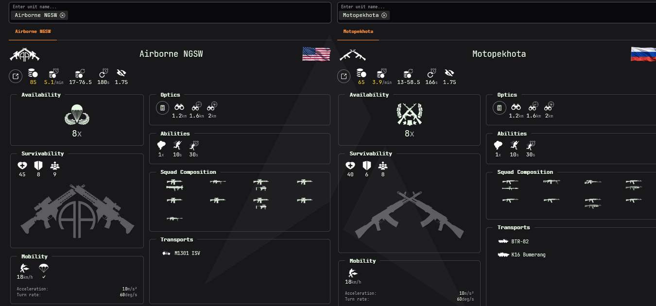 >>50417624 >Как линейная пехота мотострелки лучше Их, конечно, на 2 человека больше, но и броня у них 6 против 8 у ВДВ. Ну и возможность посадить в 2-3 разных домика в городе иногда решает. Плюс, в городе 400 метров часто хватает для распыления вражеских коробочек, а на дальняк лучше уже человеческий ПТУР ставить, вместо РПГ-29. Да даже метис на 900 пробоя. >>50417632 10 человек. ВДВ Дш при желании можно хоть на тайфуне катать, хоть в БМП-2.