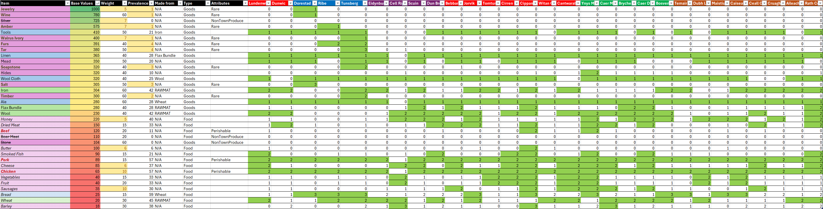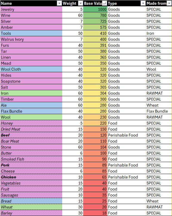 Да торговля РАБОТАЕТ В ПРИНЦИПЕ в викингах. То есть по этой таблице уже норм просто ходить между городами, деревнями и ориентироваться в закупочных ценах.