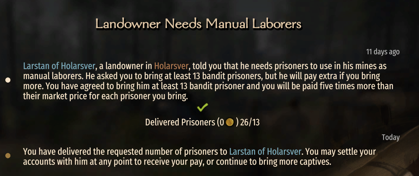В ваниле крупные деньги зарабатываются исключительно работорговлей и продажей лута, поэтому навык "содержание пленных" намного полезнее навыка "торговля", а самый выгодный старт в финансовом плане - это фарм на бандах морских рейдеров и таежных разбойников. У них самая высокая цена за голову, самый лучший лут и они пешие, поэтому их проще всего забивать в промышленных масштабах. Разгром одной банды в 20 человек уже принесет тебе 2000+ монет с пленных и такую же сумму с лута, а банд в одном районе ходит много. Итого, устроив зачистку возле Кудана и Ривачега можно спокойно поднять за неделю 40-50 тысяч денаров, упирается все только в твой навык содержания пленных и наличие посредника в таверне в нужный момент.