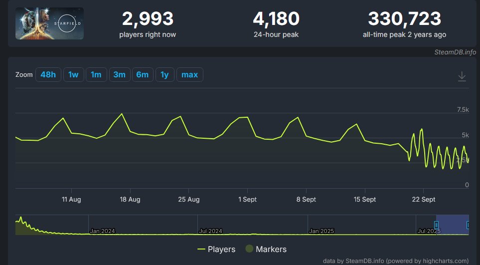 >>50267896 А онлайн-то падает. Раньше были стабильные 4-5к, потом стало 3-4, теперь уже 2-3, а в худшие дни и до 2к не дотягивается. Ещё через год, без учёта длс-спайков, онлайн игры рухнет до 1к, а потом даже его набирать не будет. Ужасная картина падения, даже страшнее, чем была у пираний, которые свой элекс 2 выпустили и через год закрылись. Элекс конечно же весь из говна и палок, как и ризен, если смотреть на него в целом, а не в относительно удавшиеся точки. Но пираньи хотя бы не мучались. Беседка же будет гнить долго и вонюче, разлагаясь на плесень и липовый мёд. Этого колосса на говёных ногах мы ещё долго будем поминать недобрым словом.
