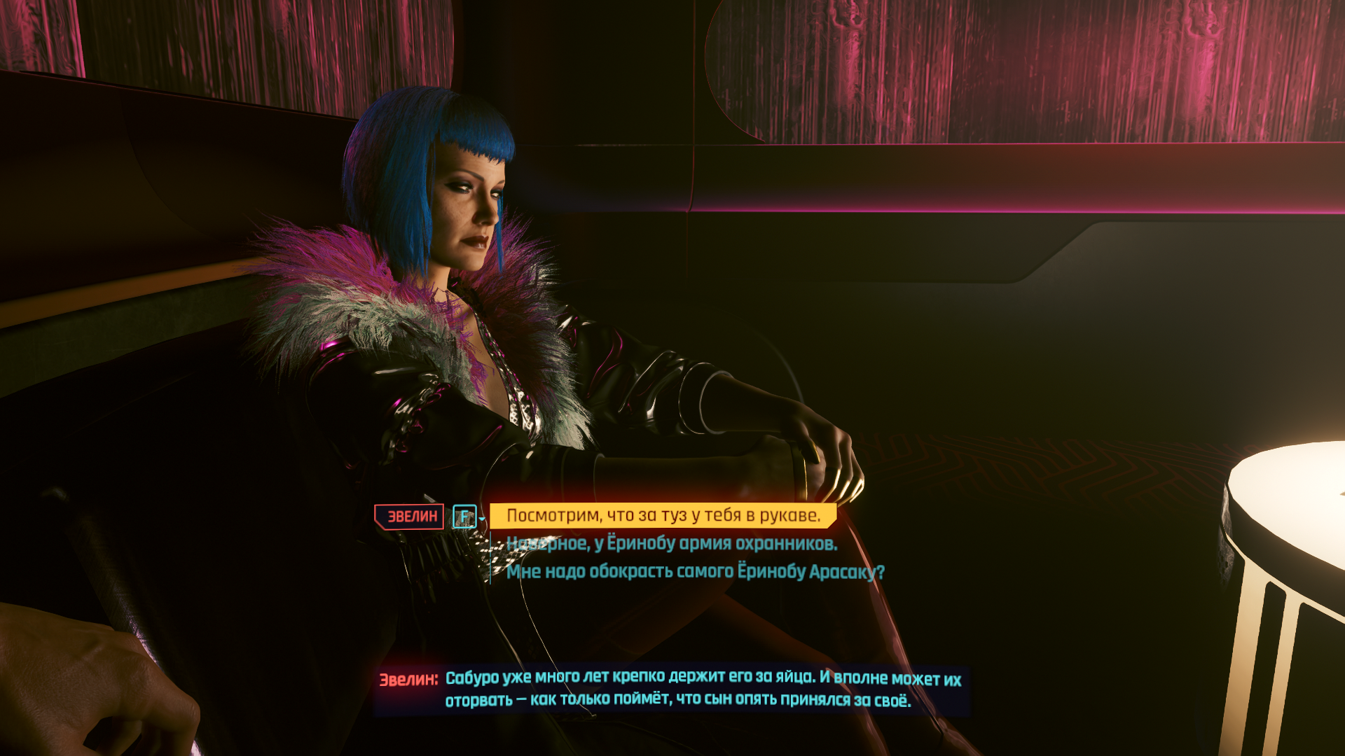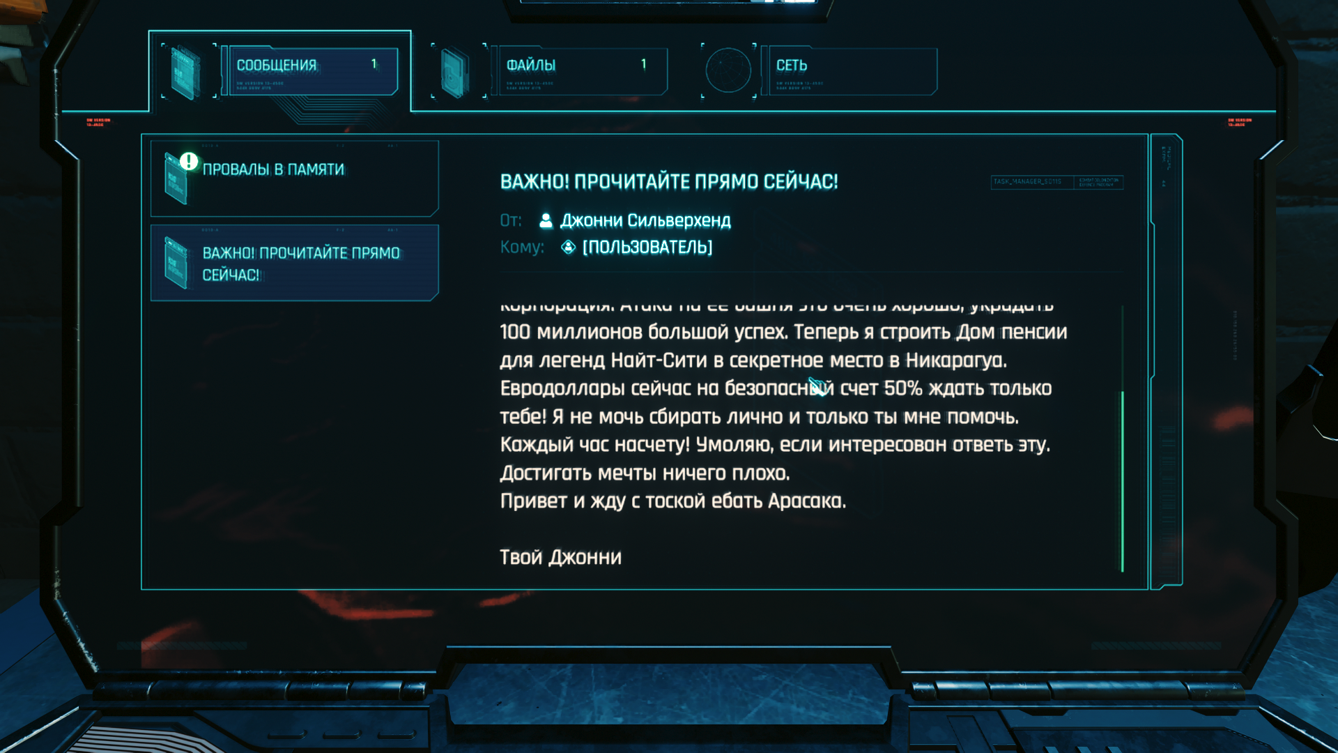 >Лол, интересно в чем? Майерс сравнительно легко втерлась в доверие к Ви. Однако сцена в космопорту показывает какая она расчетливая циничная тварь на самом деле и жизни её самых ценных подчинённых для неё ничто. Она руками Ви устраняет слишком самостоятельного Хансена и возвращает себе своё главное оружие, позволяющее ей и дальше удерживать власть, опять же руками Ви