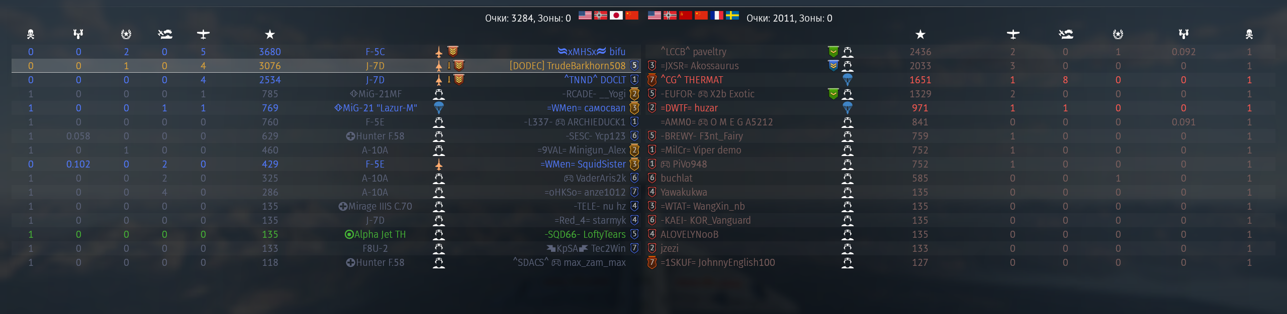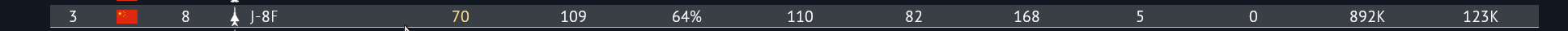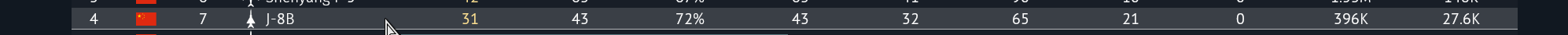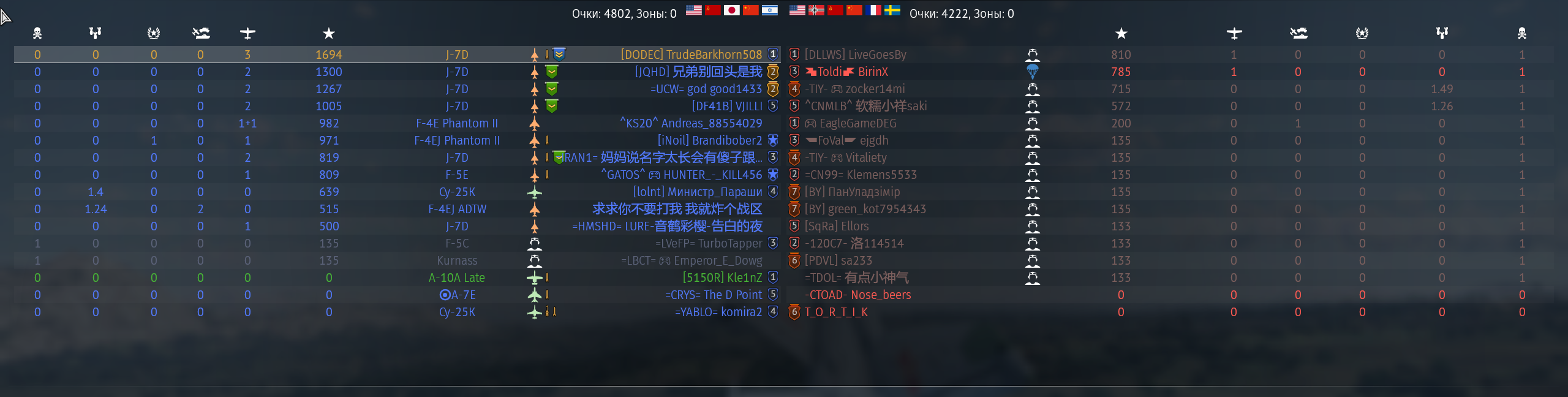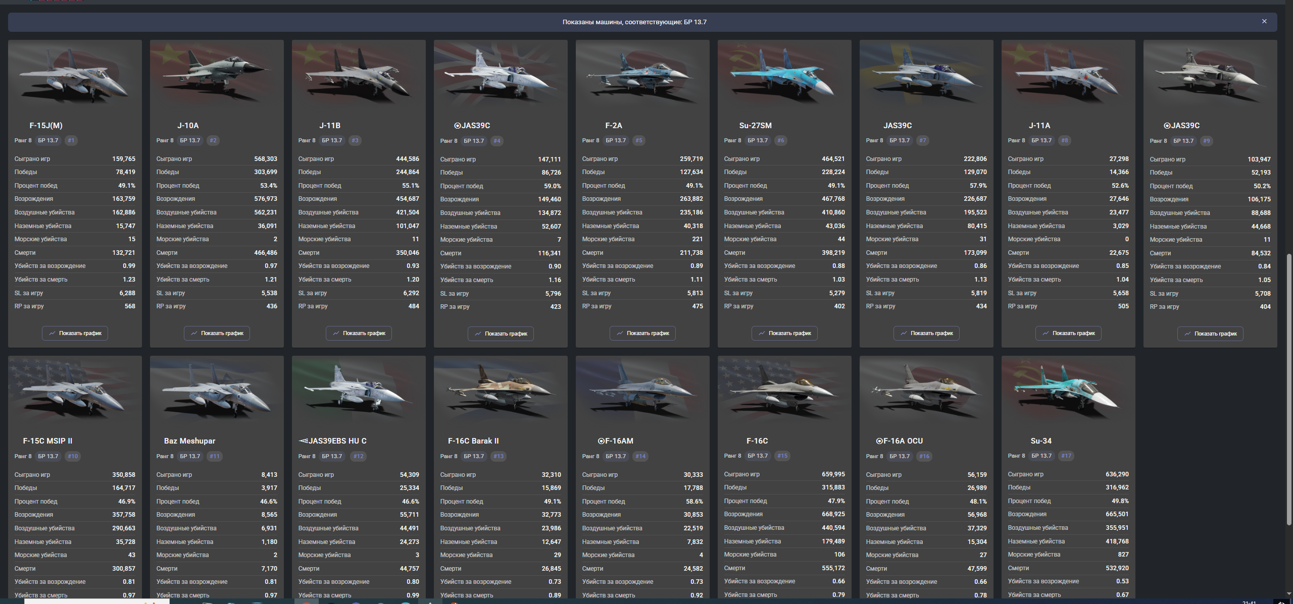 Сортировка по КД 13.7 самолетов. У китайцев такие же показатели как у Ф-15J(M) но в 5 раз(!!!) больше боев. И да учитывая что JM лучше 15С и на том же бре... И эти показатели лучше любого натолитака кроме французов. Но у тех - мики.