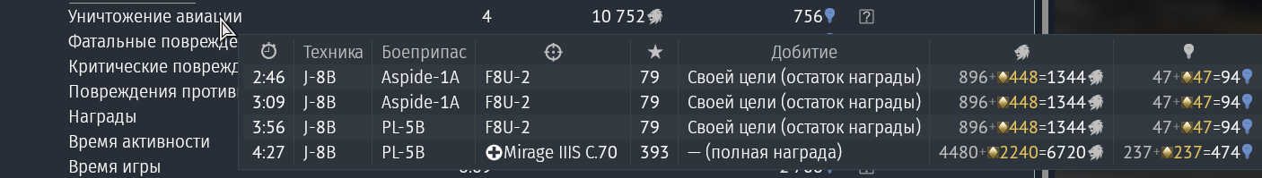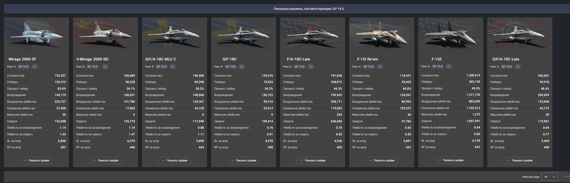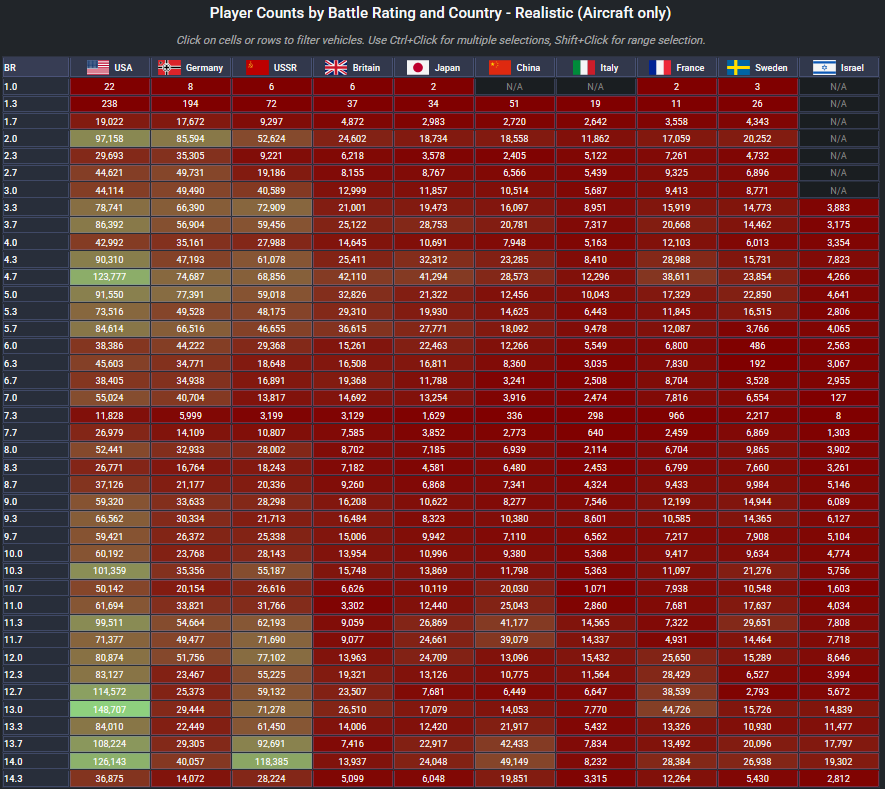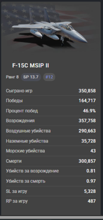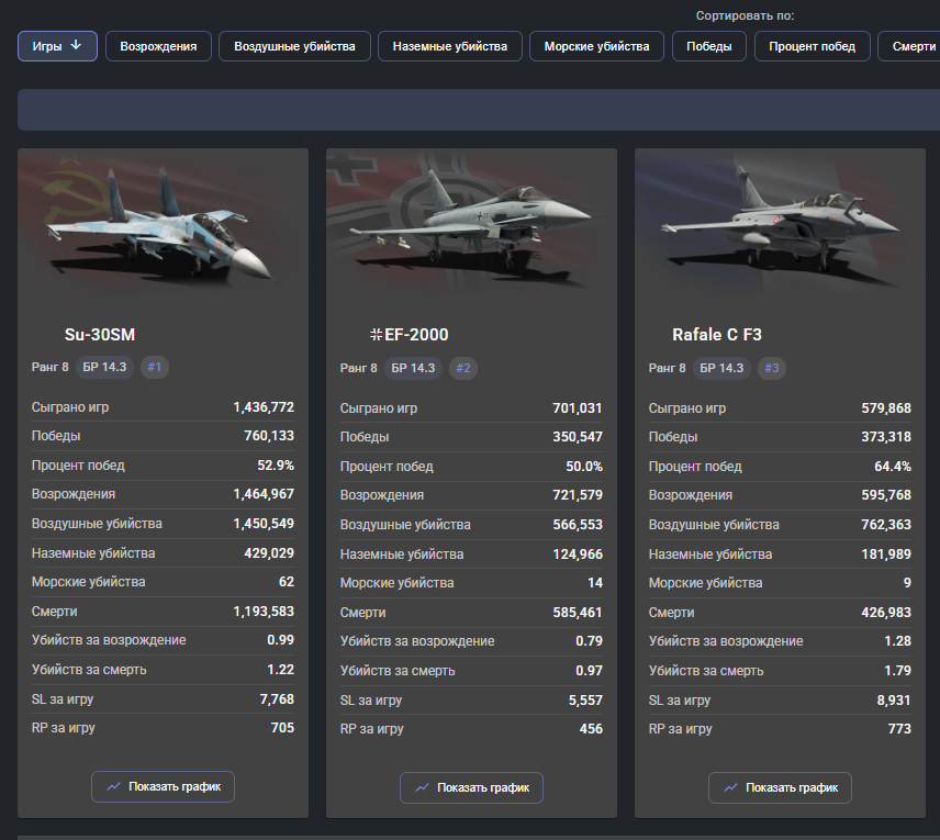 Сортировка по КД 13.7 самолетов. У китайцев такие же показатели как у Ф-15J(M) но в 5 раз(!!!) больше боев. И да учитывая что JM лучше 15С и на том же бре... И эти показатели лучше любого натолитака кроме французов. Но у тех - мики.